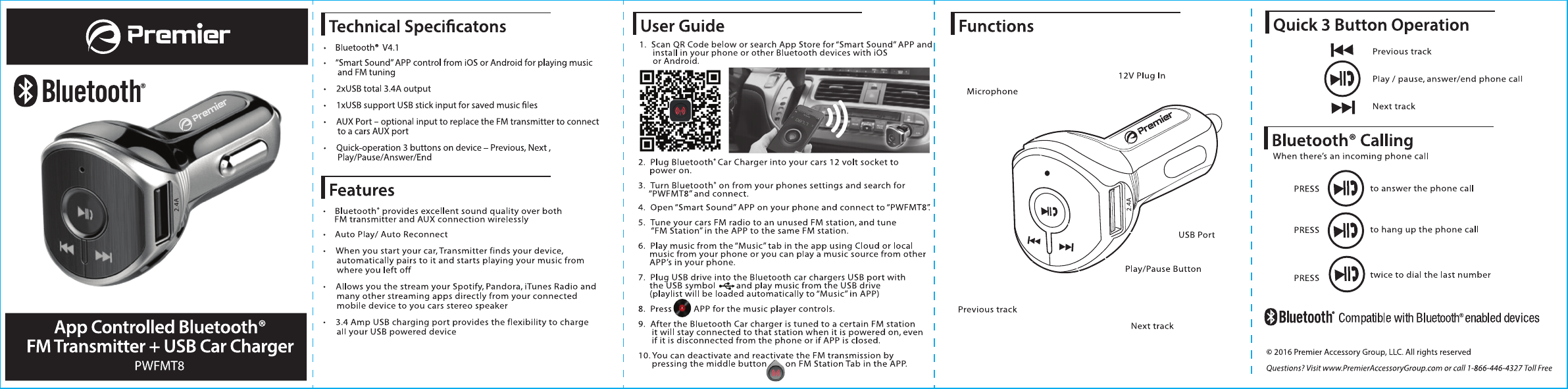 Premier Accessory Group PWFMT8 APP controlled Bluetooth FM transmitter+USB Car charger User Manual PWFMT8 Manual final