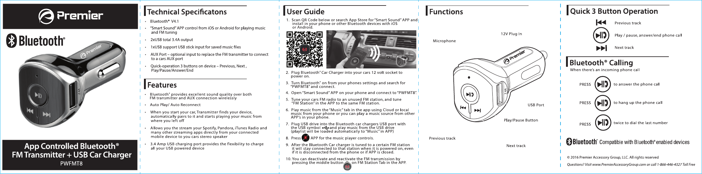 Premier Accessory Group PWFMT8 APP controlled Bluetooth FM transmitter+USB Car charger User Manual PWFMT8 Manual final