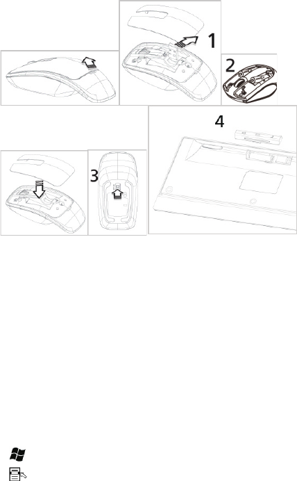 ● Open the battery compartment cover at the top of the mouse. Remove the USB receiver (1).