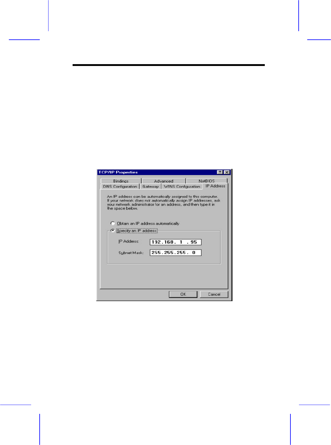 – TCP/IP Properties – IP Address settings (i.e. ‘Specify an