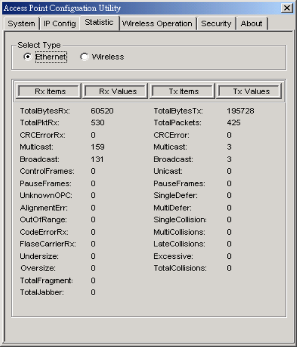 In this page you can see the statistic of the Module linking in Ethernet or Wireless.