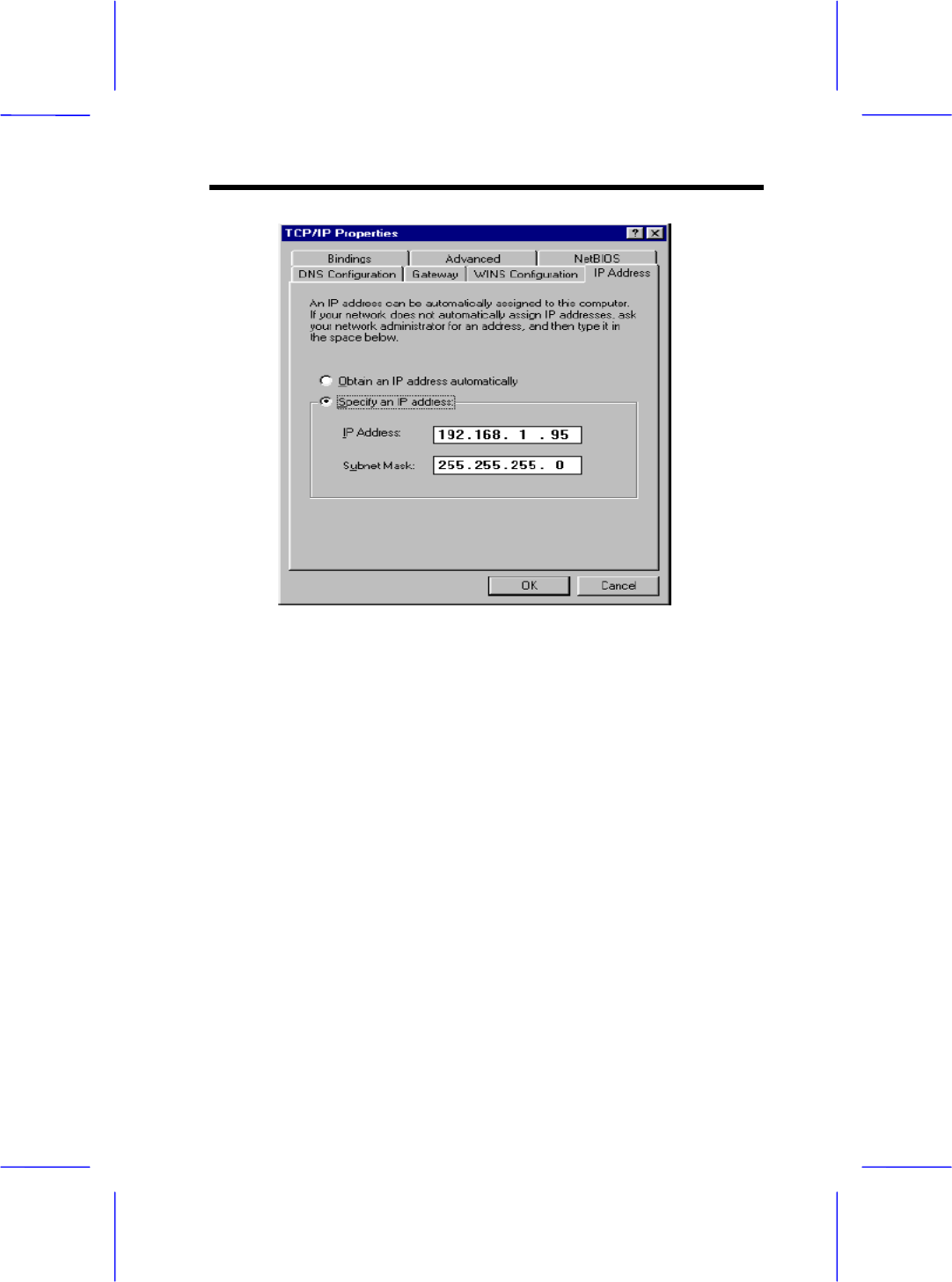 – TCP/IP Properties – IP Address settings (i.e. ‘Specify an IP