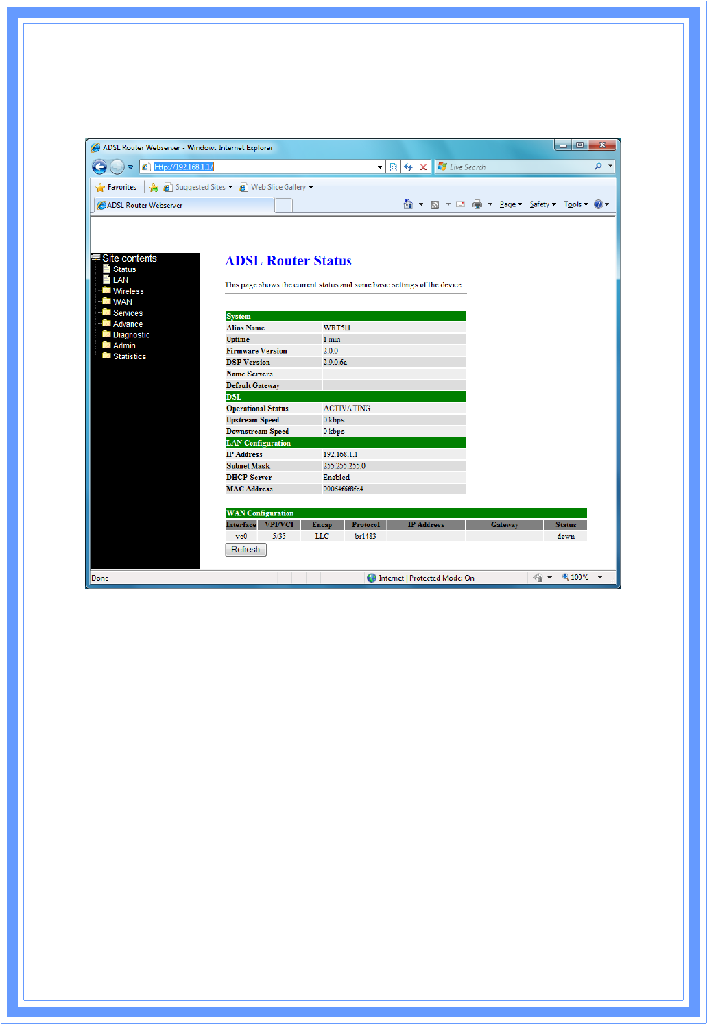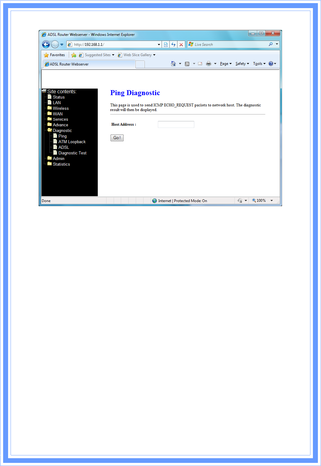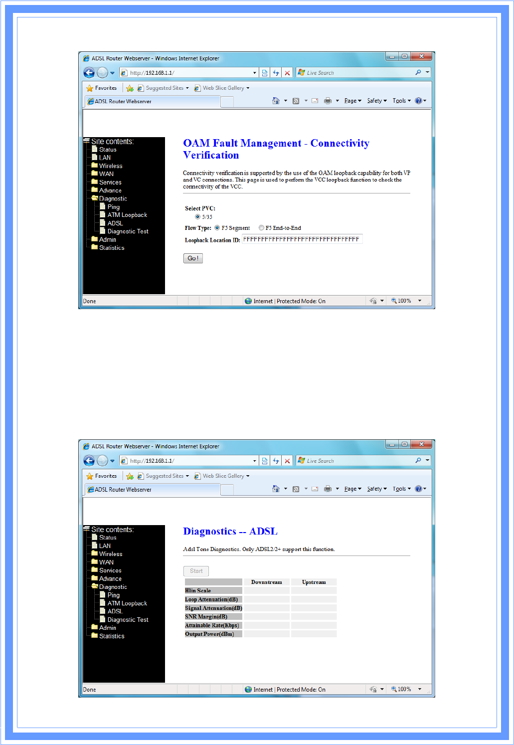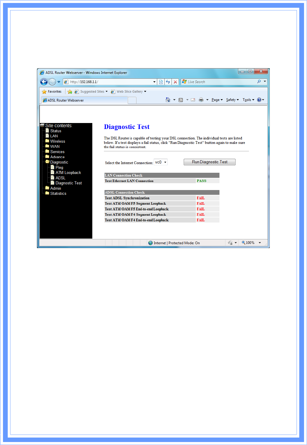 ThispageshowstheADSLdiagnosticresult.ClickStartbuttontostarttheADSLdiagnostic.