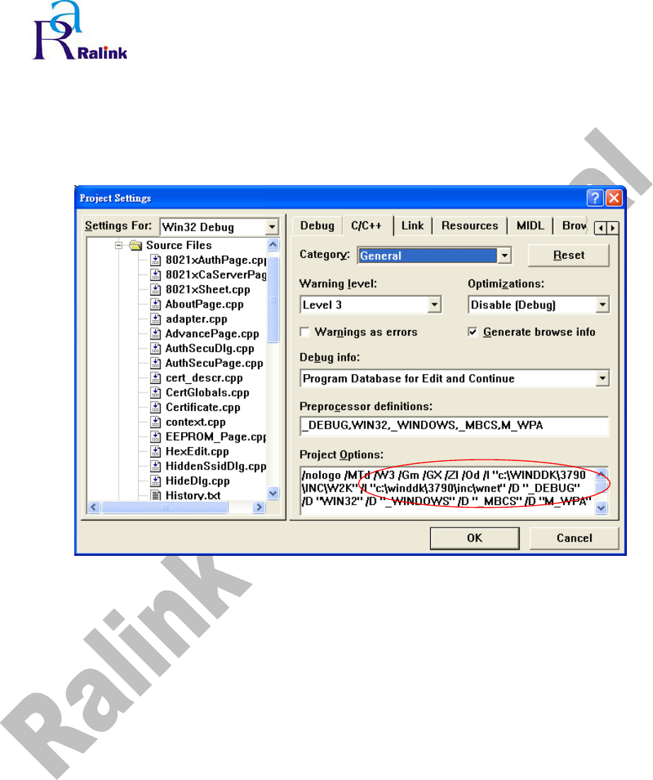 Step 2ΚMake sure the path of Windows DDK 3790 is correct in “C/C++” tag of Project Settings..