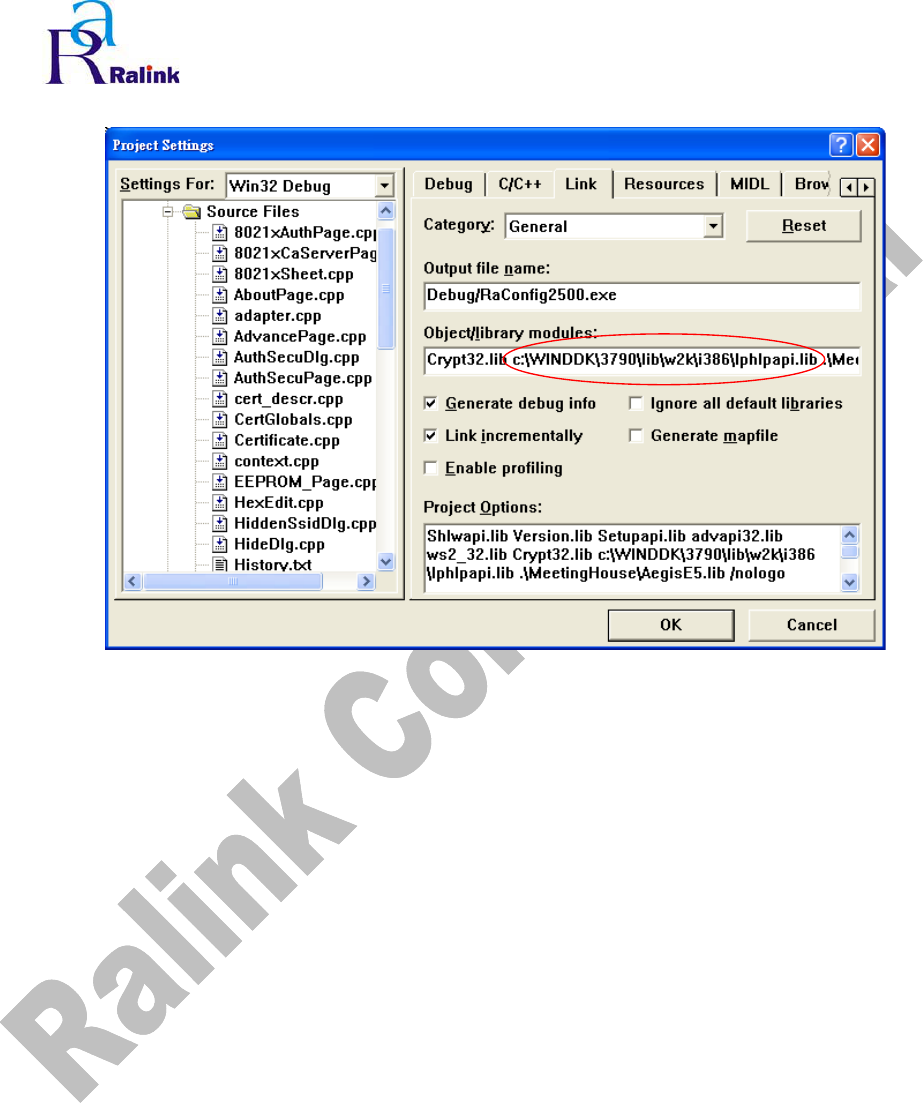 Step 3ΚMake sure the path of Windows DDK 3790 is correct in “Link” tag of Project Settings.