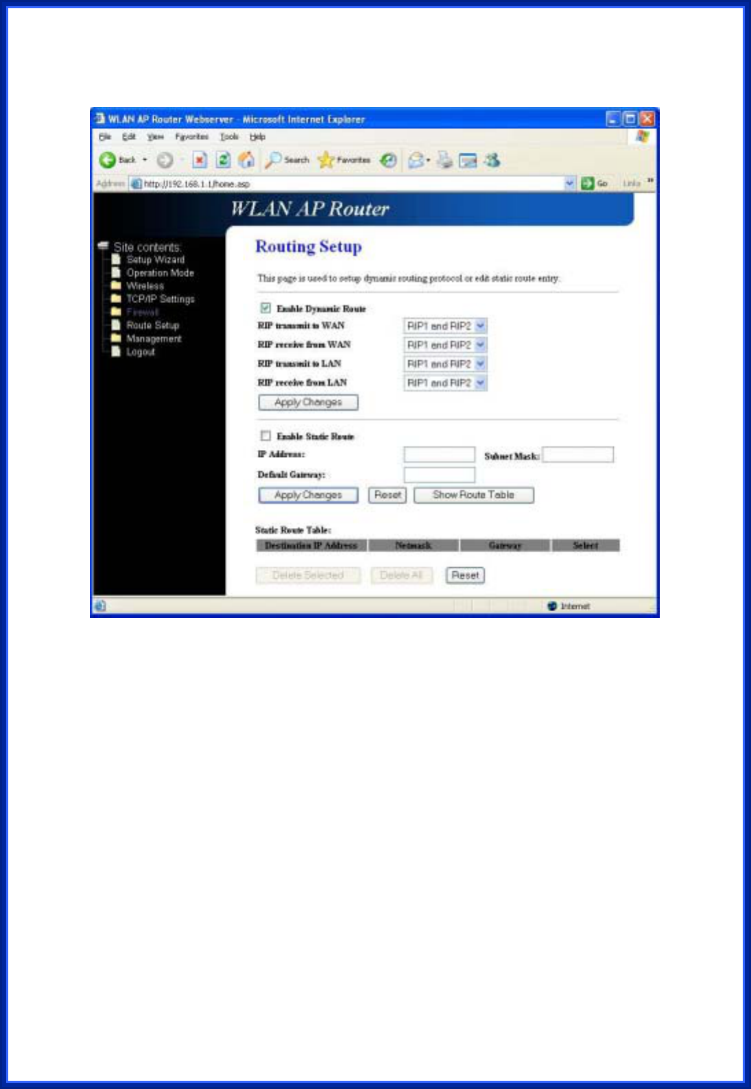 This page is used to setup dynamic routing protocol or edit static route entry.