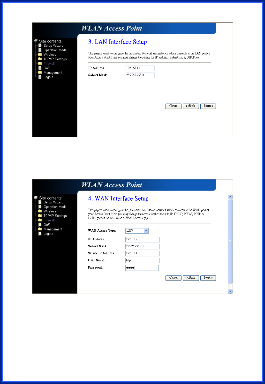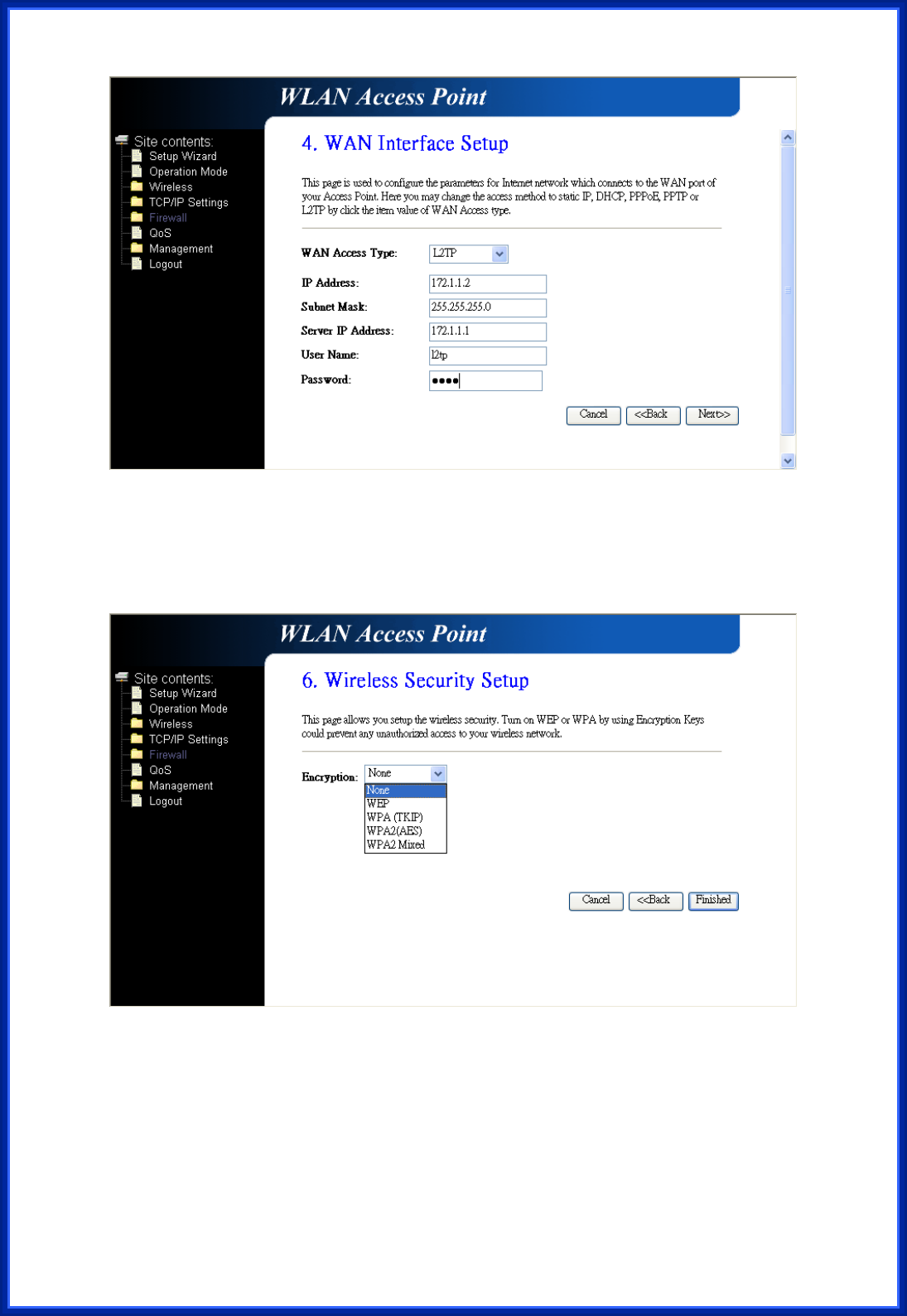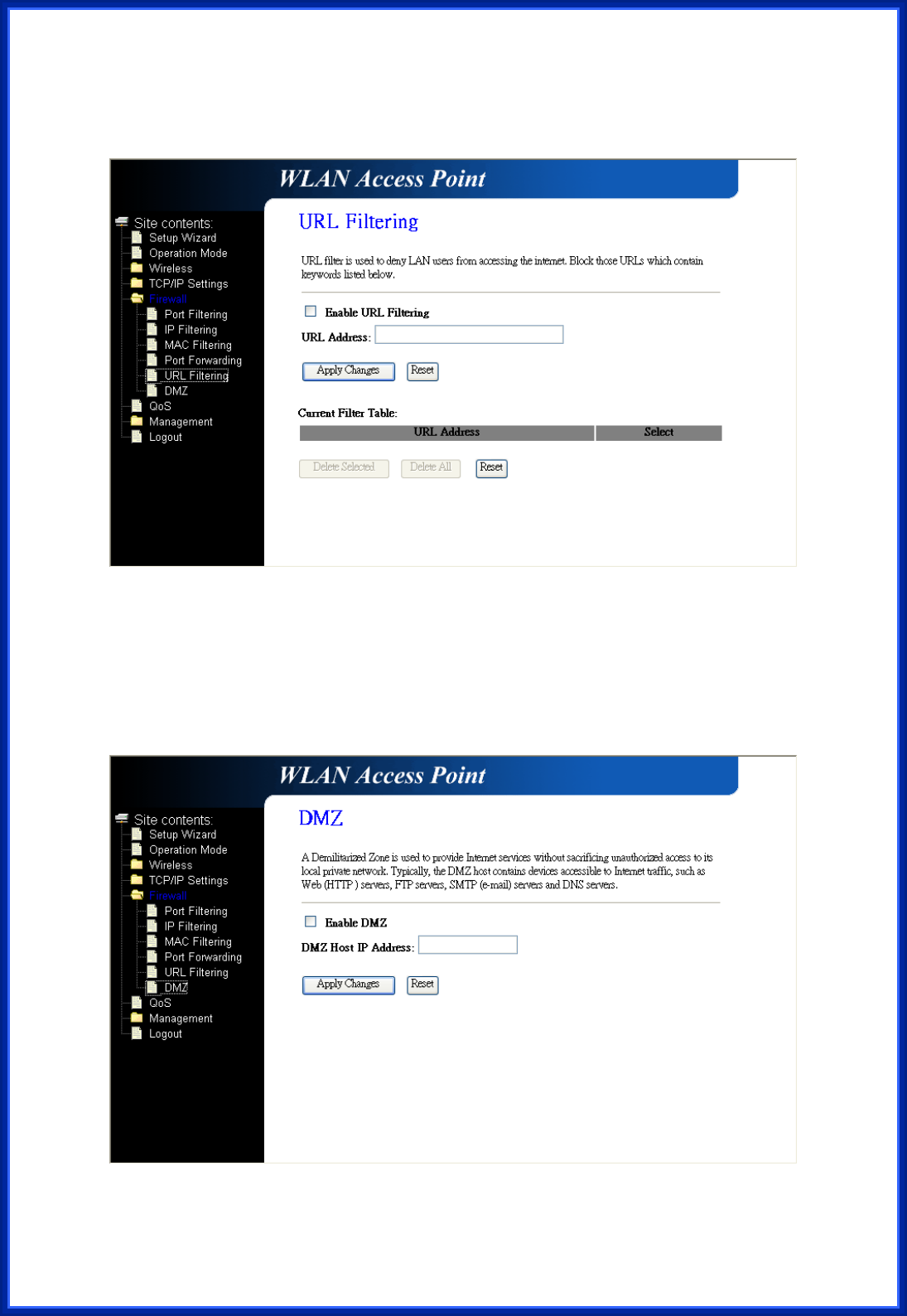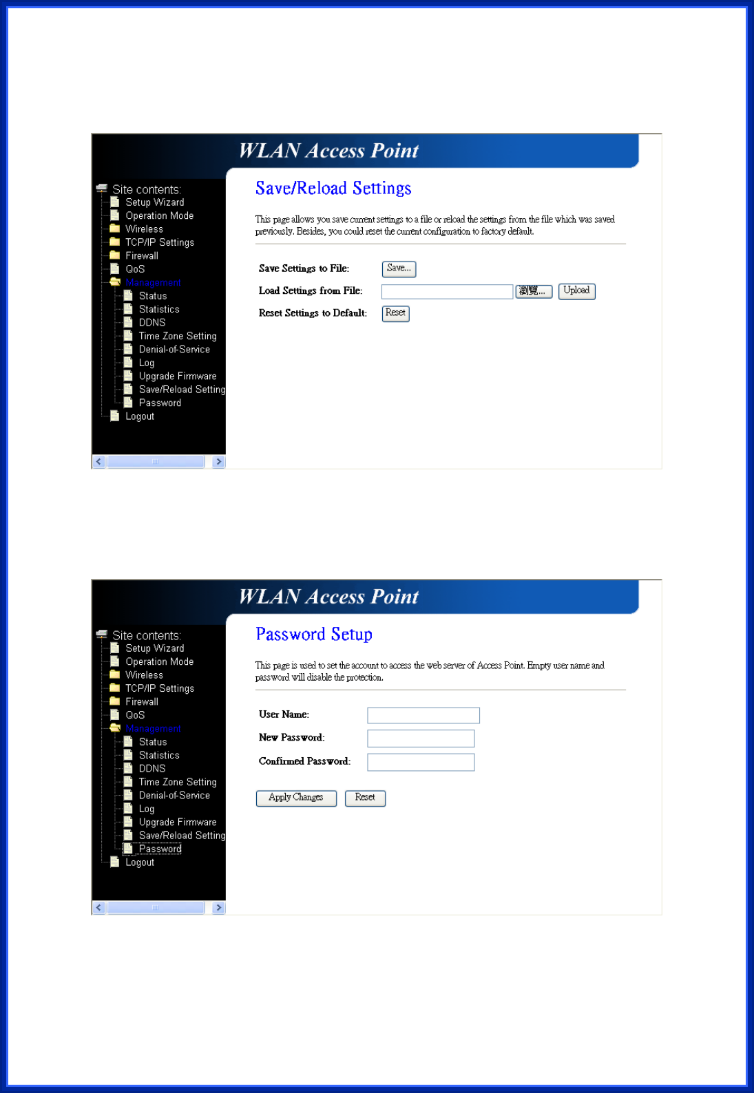 This page is used to set the account to access the web server of AP Router. Empty user name