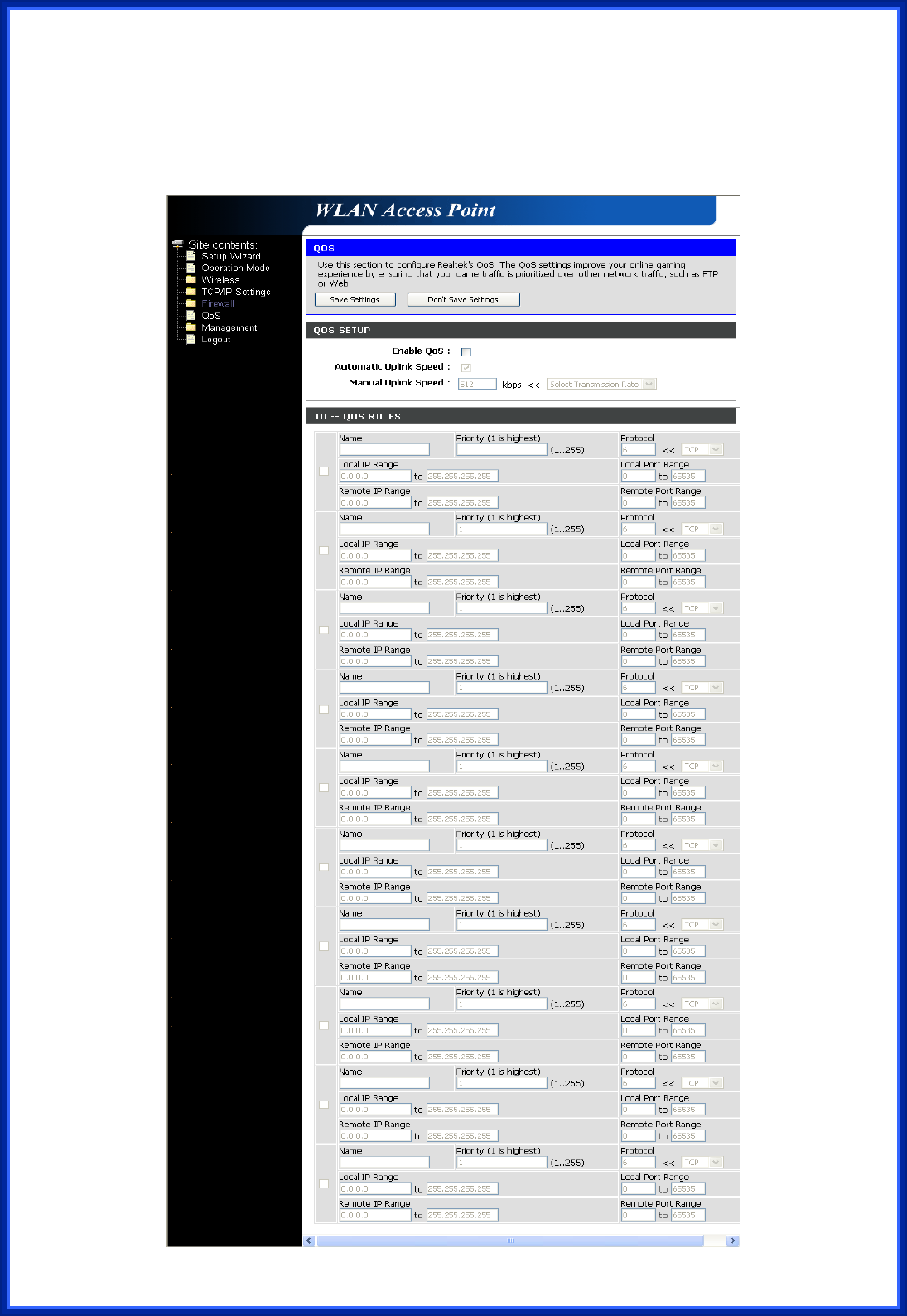 3. Configure QoS Rules – Name, Priority (1~255, 1 is highest), Protocol, Local IP range,