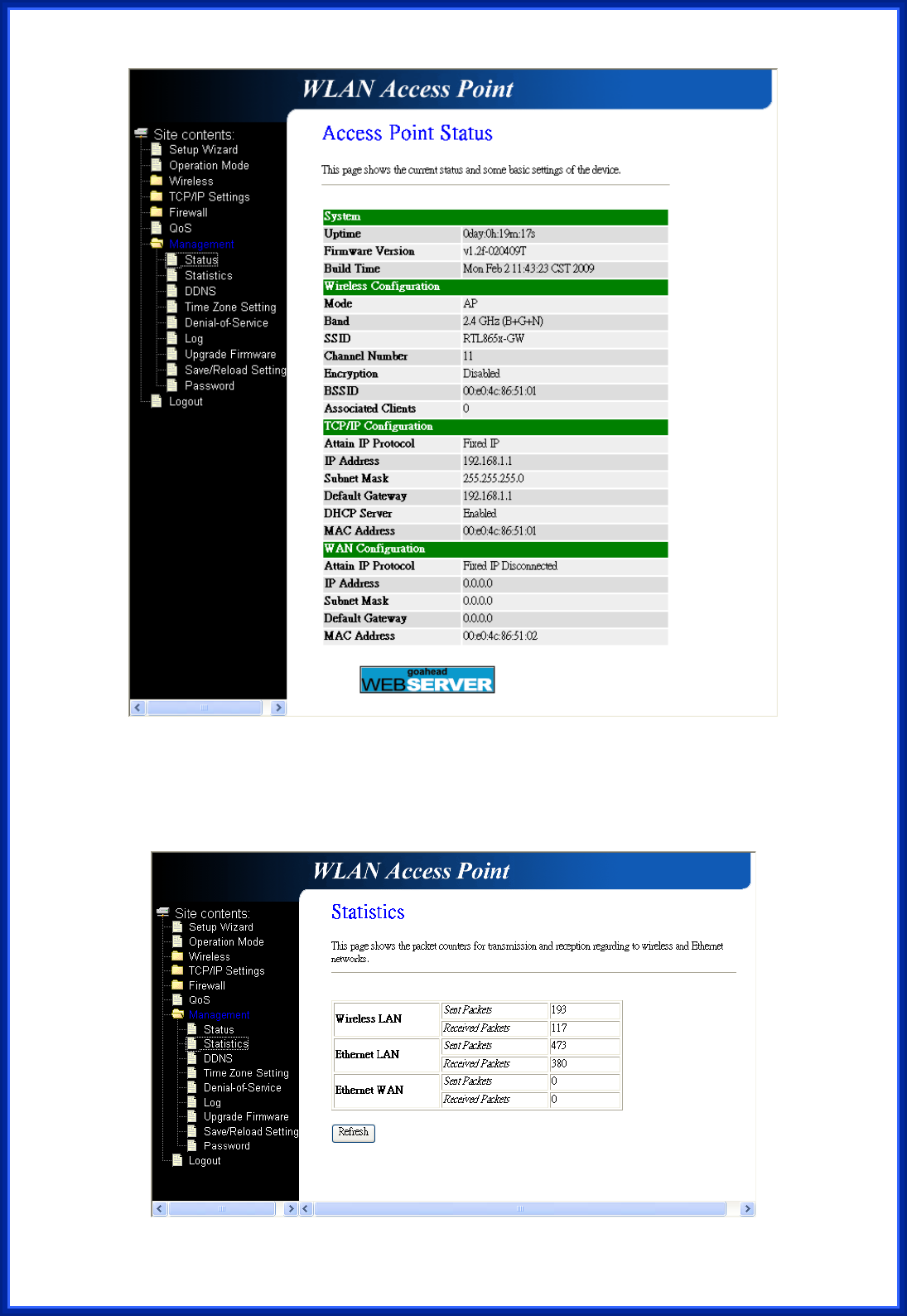 This page shows the packet counters for transmission and reception regarding to wireless and