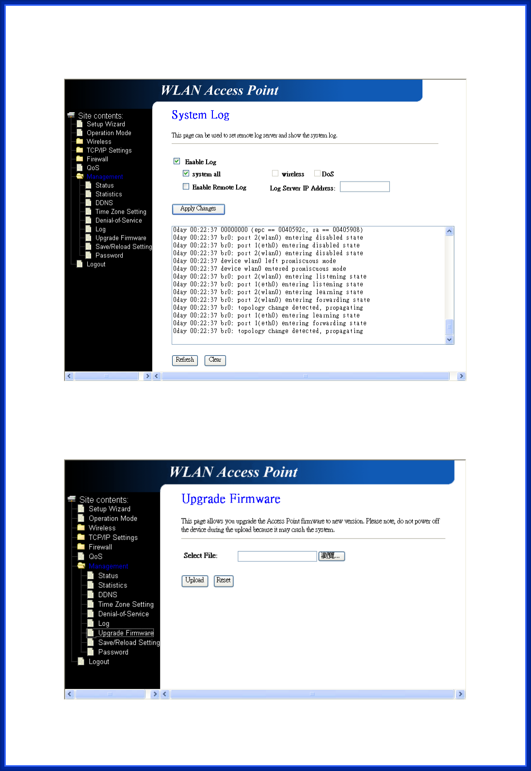 This page can be used to set remote log server and show the system log.