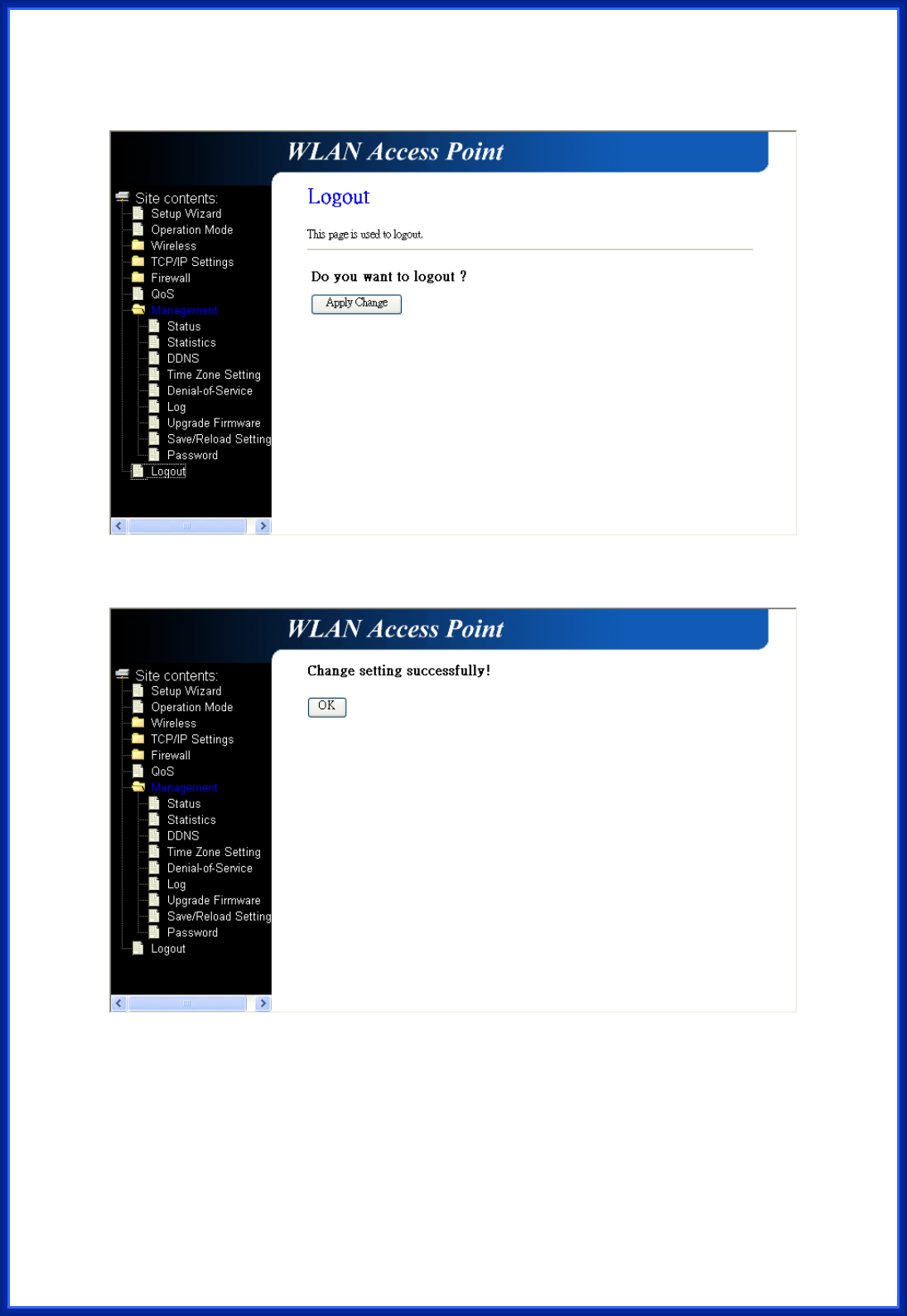 Click “Apply Change” button to logout the webserver. And then, you will see the below