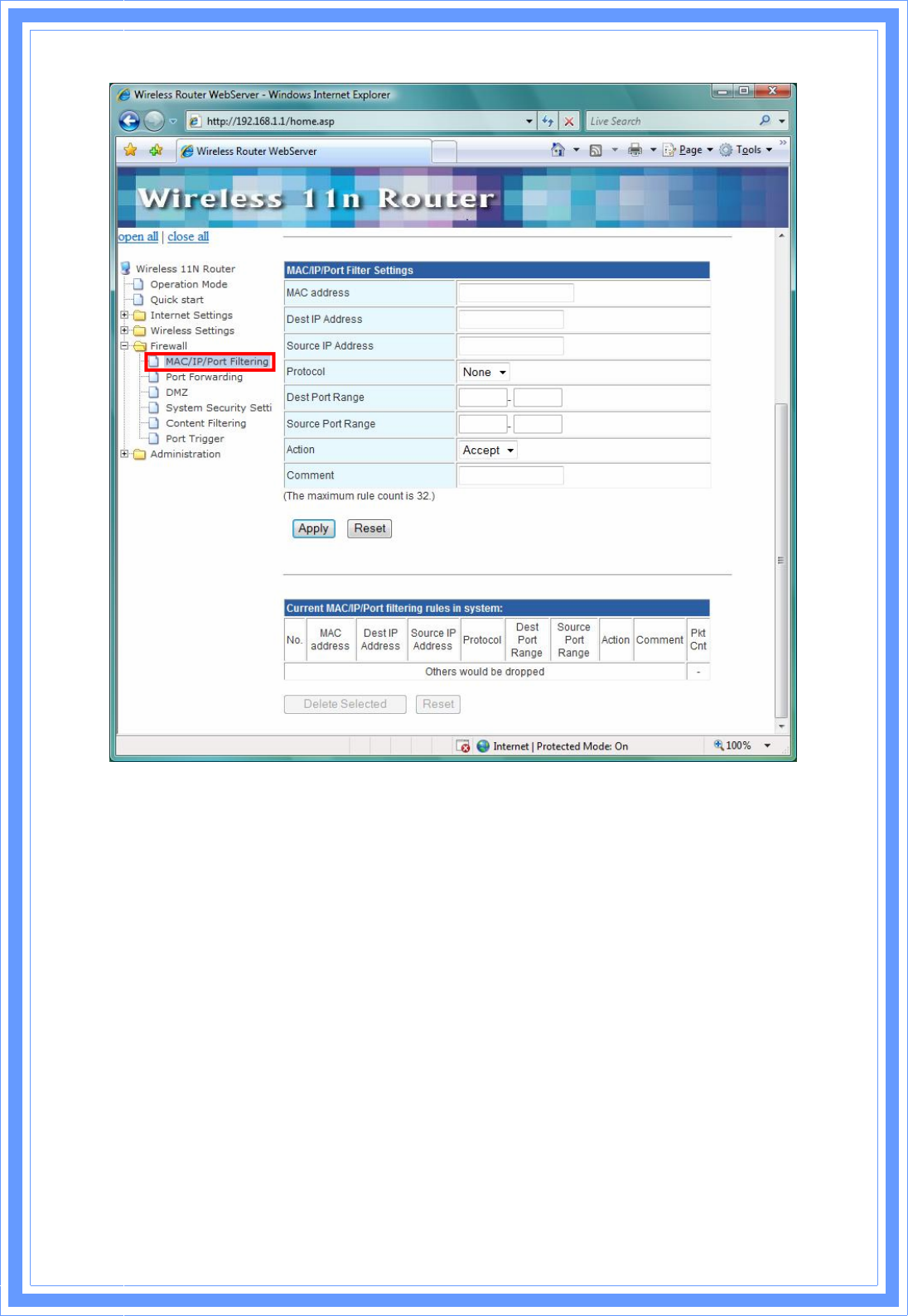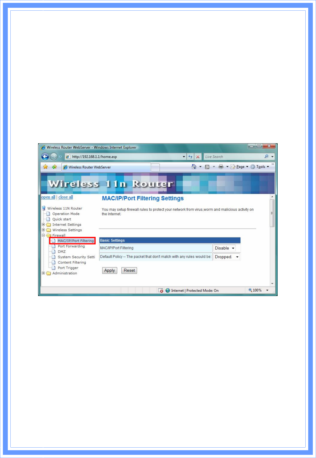 MAC/IP/Port Filtering: Enable this function, all list from the filtering will be deny the internet