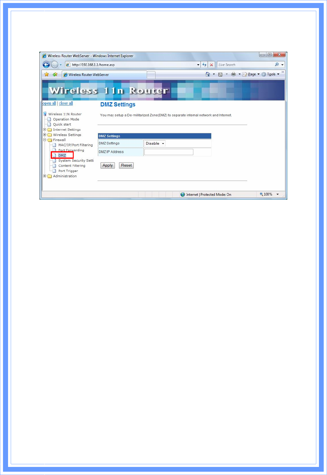 DMZ Setting: If the DMZ Host Function is enabled, it means that you set up DMZ host at a