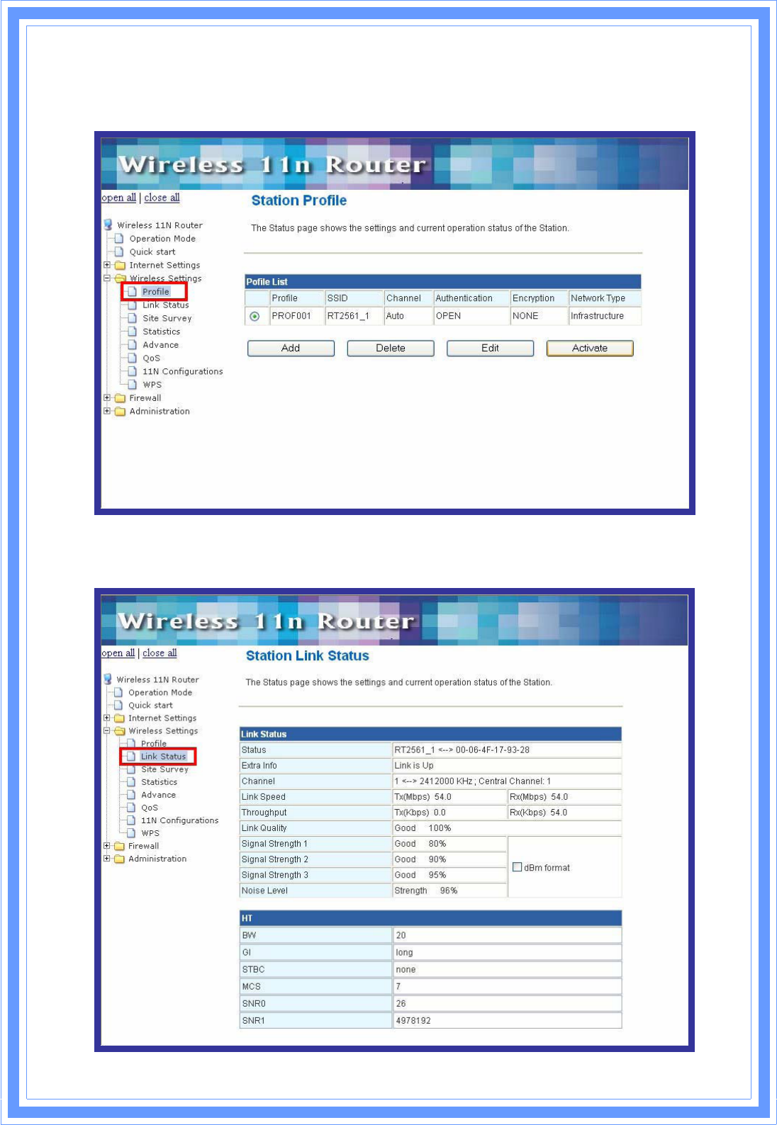 [Link Status] The Station Link Status page shows the settings and current operation status