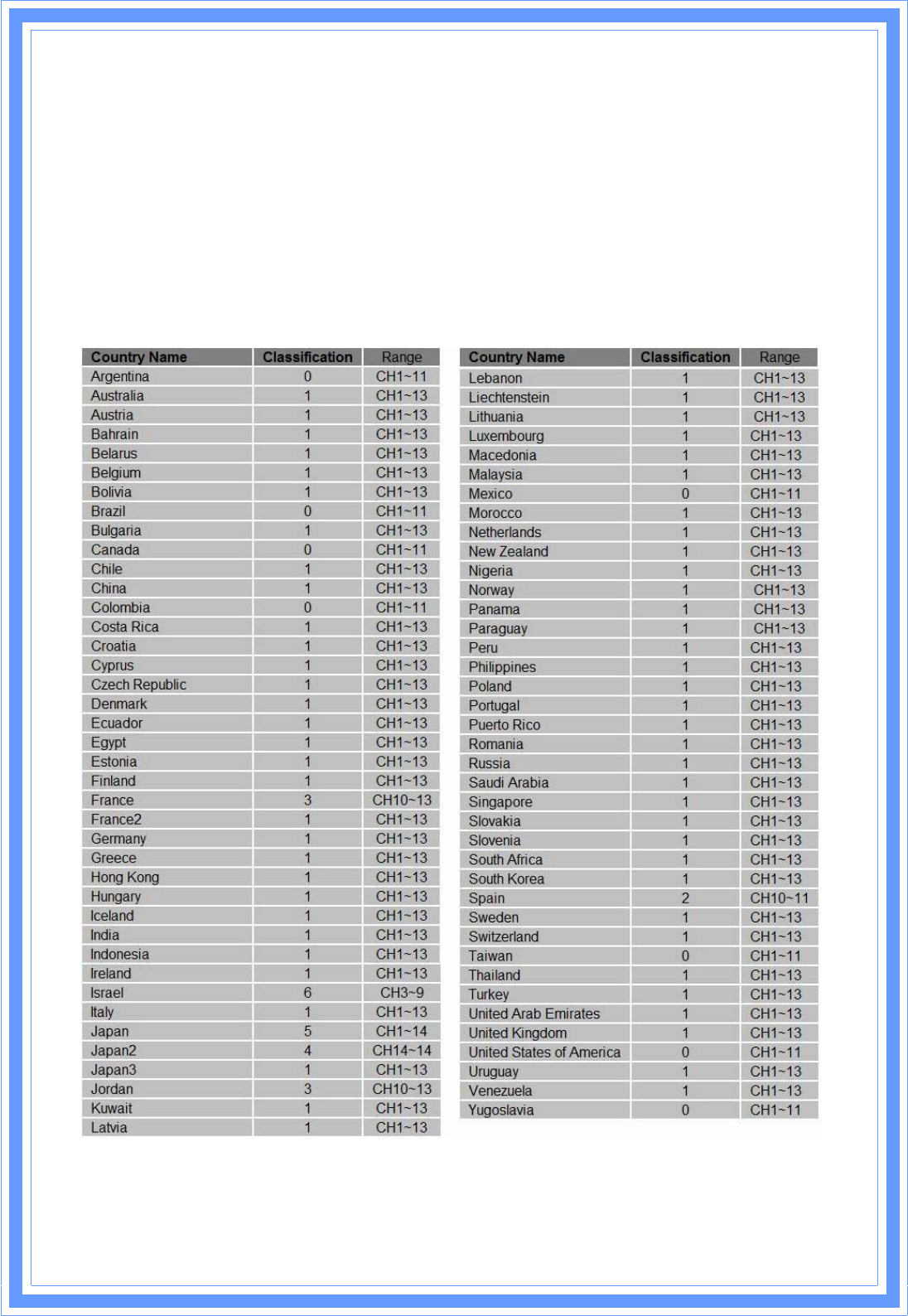 CH5-13. Please refer to below Channel Classification and range, Country Channel list to
