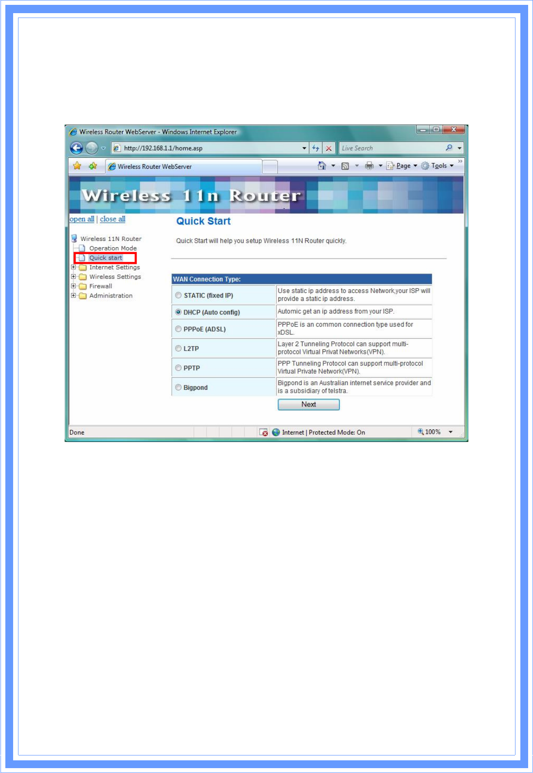 Quick Start will help you setup Wireless 11n Router quickly. There have five types of WAN