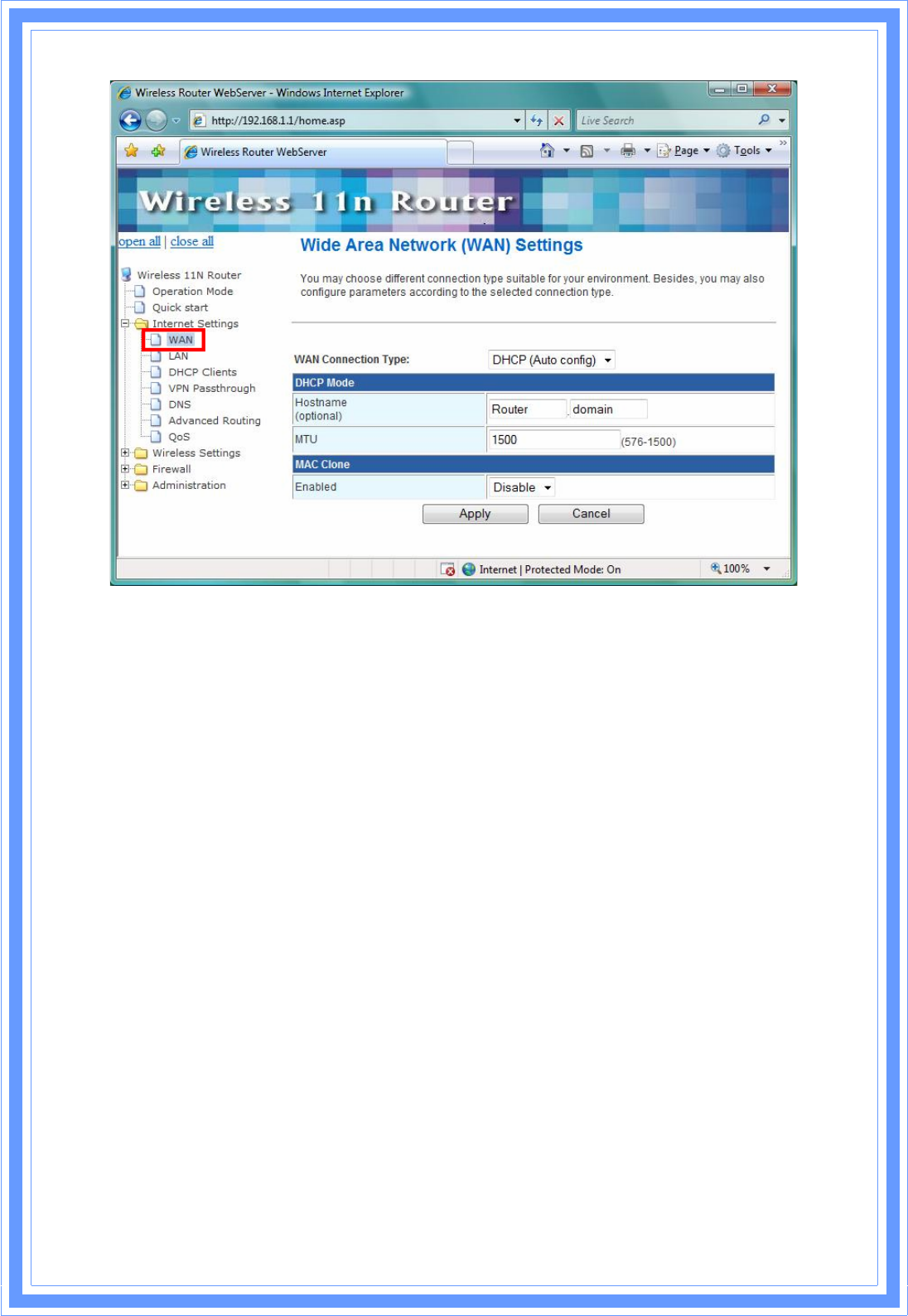 device such as Cable modem or ADSL CPE. Click WAN on Internet Setting, below screen will