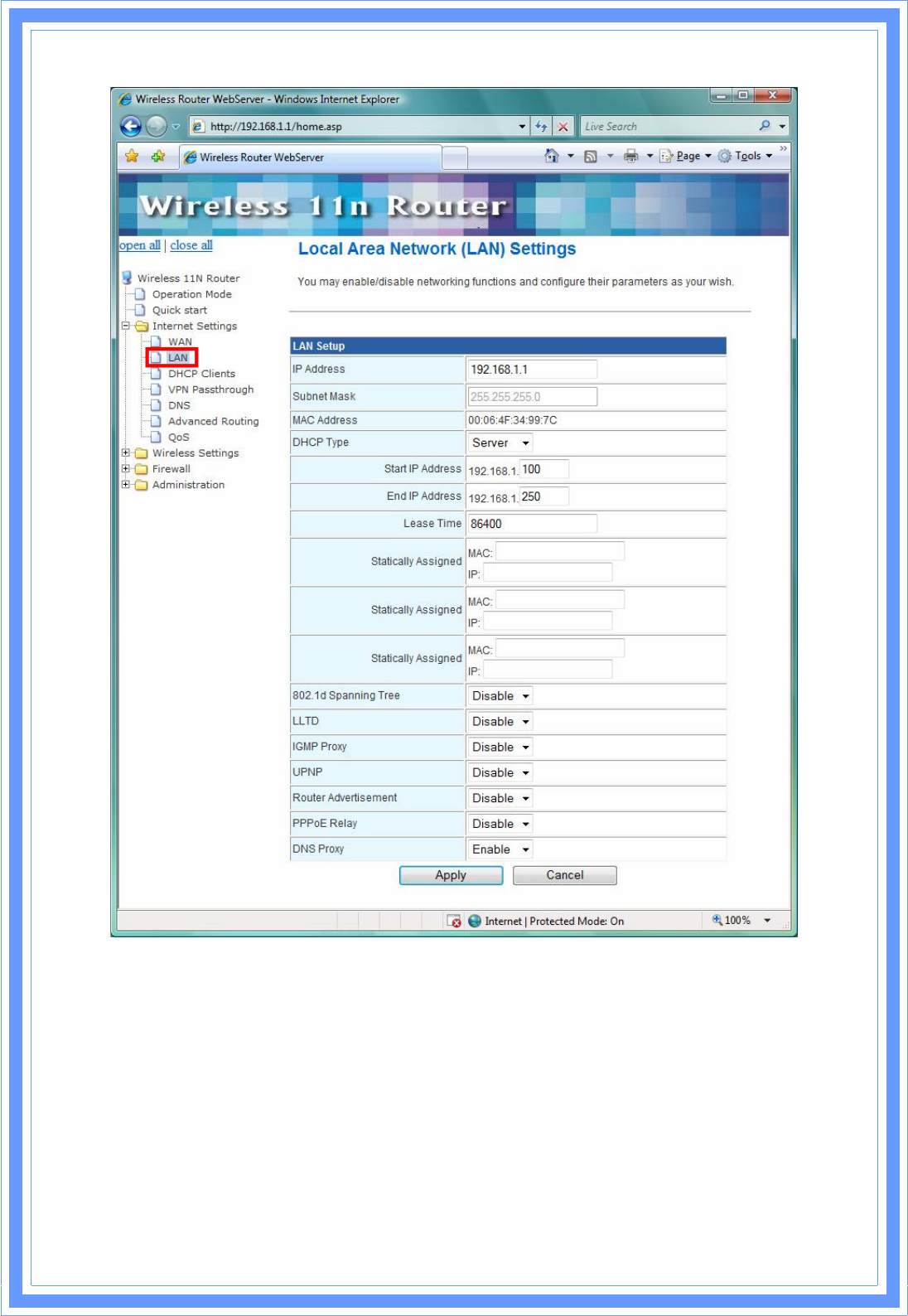 Click LAN on Internet Settings, below screen will prompt for LAN setting.