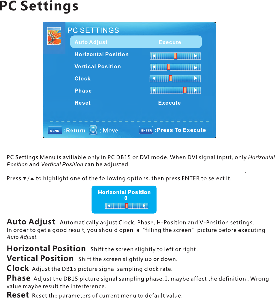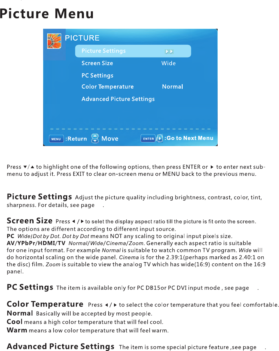 press “ENTER” button toconfirm the value you changed.Press the “ ”button to return to the left submenu;