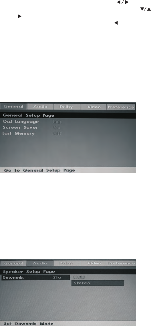 desired menu page (General / Audio / Dolby / Video / Preferences),and use “ ” buttons to select