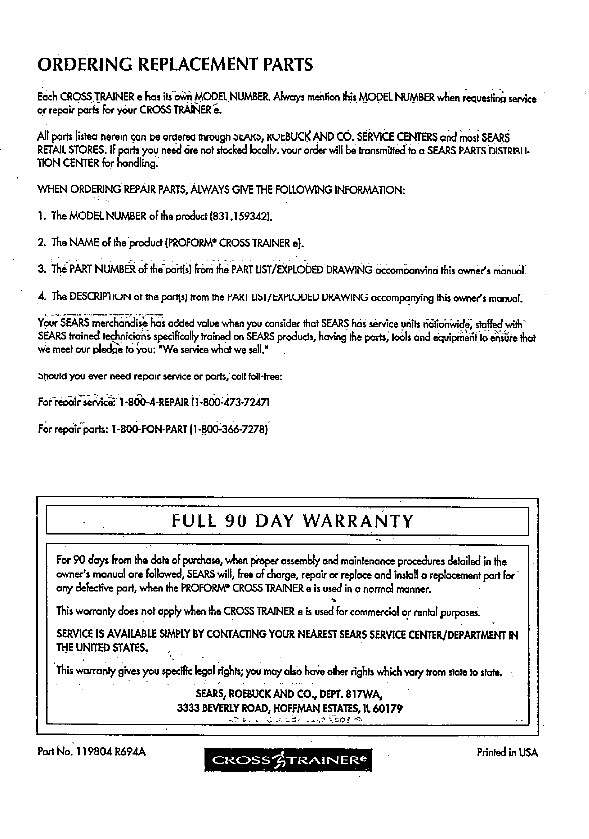 This warranly rices not apply when the CROSSTRAINER• is usedfor commercialo.rrental purposes.