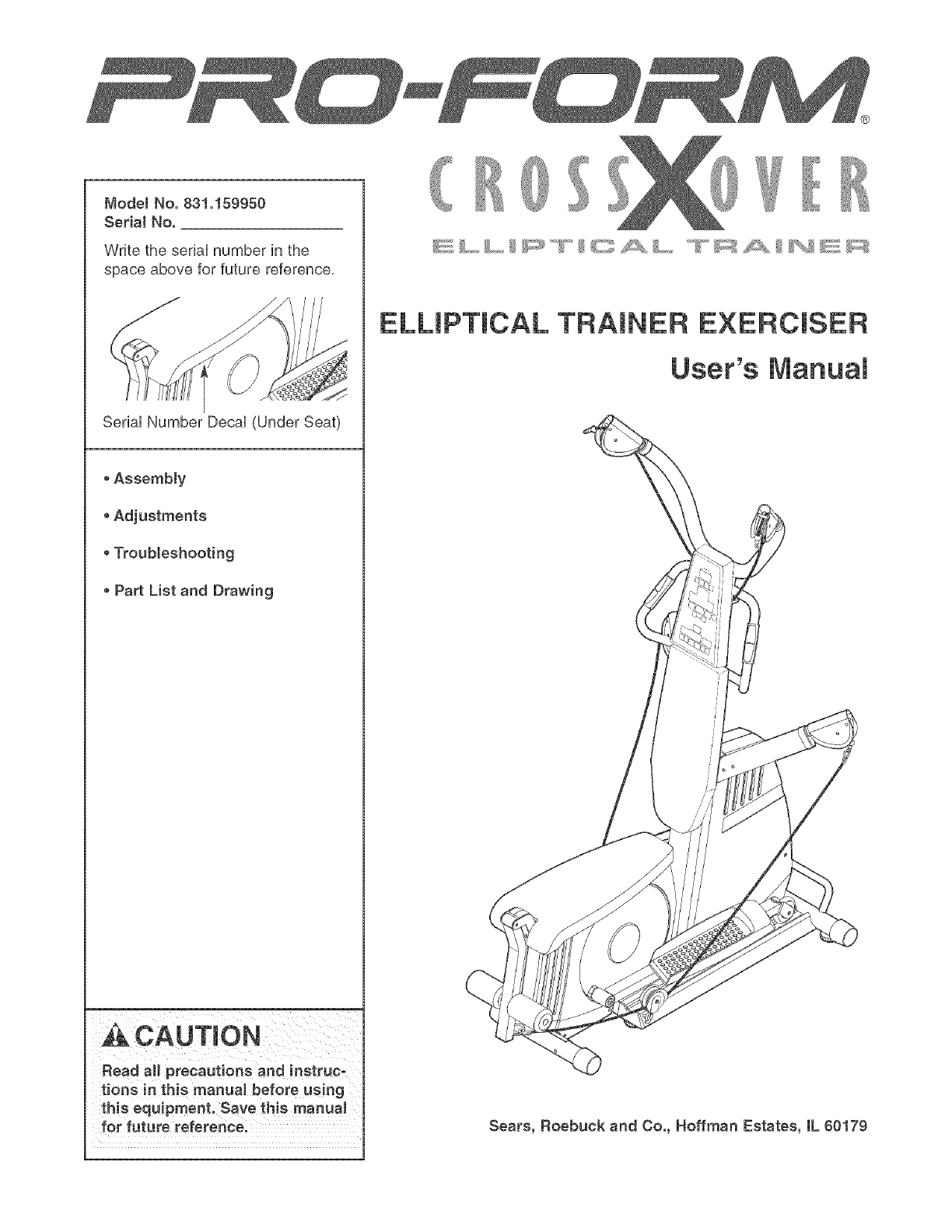 User Manual: Proform 831159950 831159950 PROFORM ELLIPTICAL TRAINER - Manuals and Guides View the owners manual for your PROFORM ELLIPTICAL TRAINER #831159950. Home:Fitness Equipment Parts:Proform Parts:Proform ELLIPTICAL TRAINER Manual