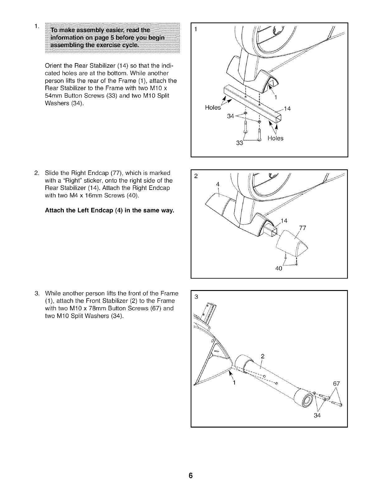 Assembly requires two persons. Place all parts of the exercise cycle in a cleared area and remove the pack-