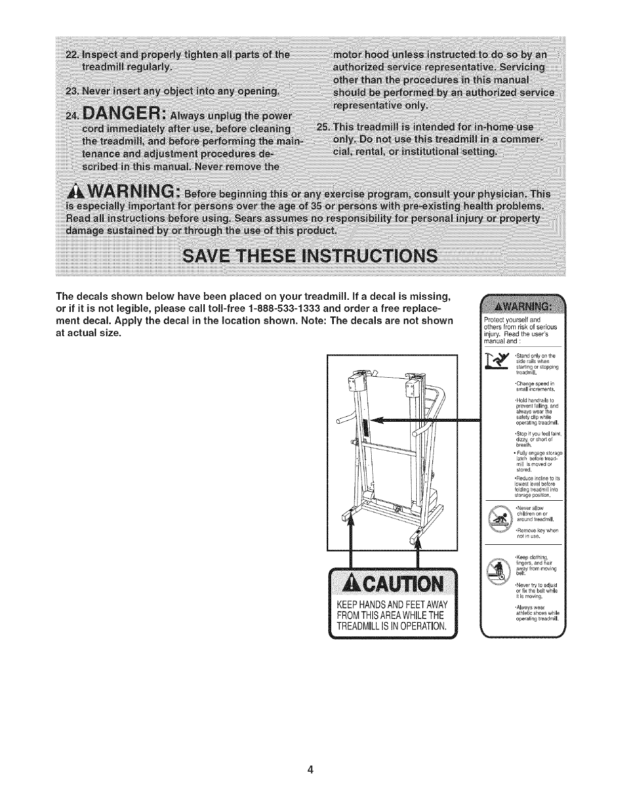 The decals shown below have been placed on your treadmill, if a decal is missing,