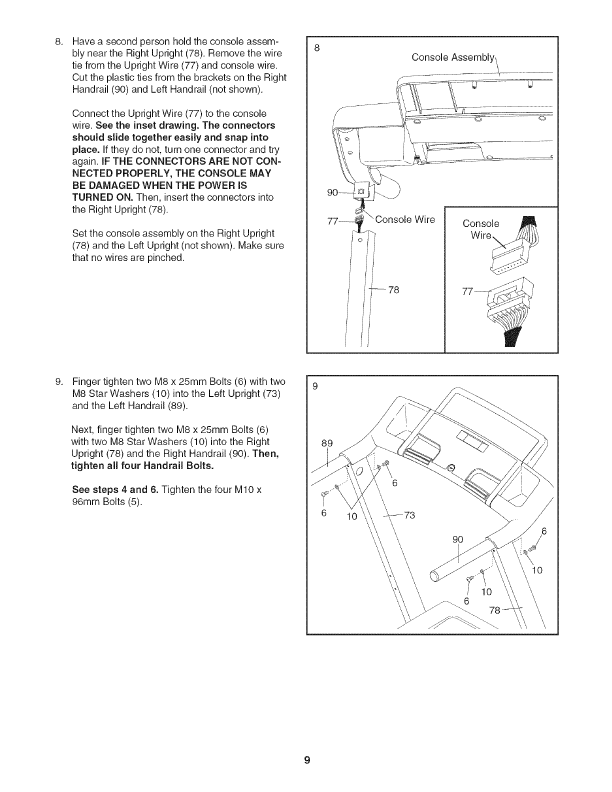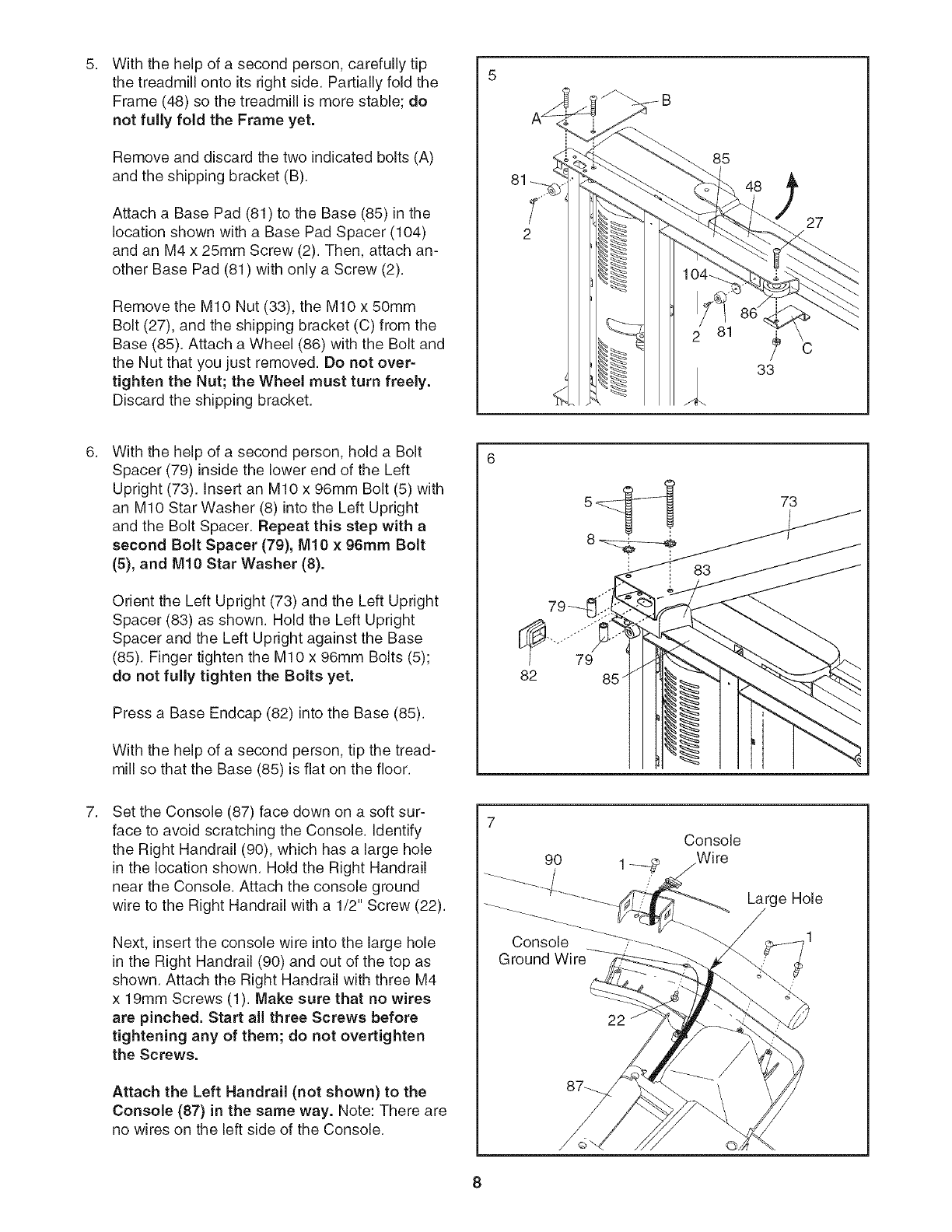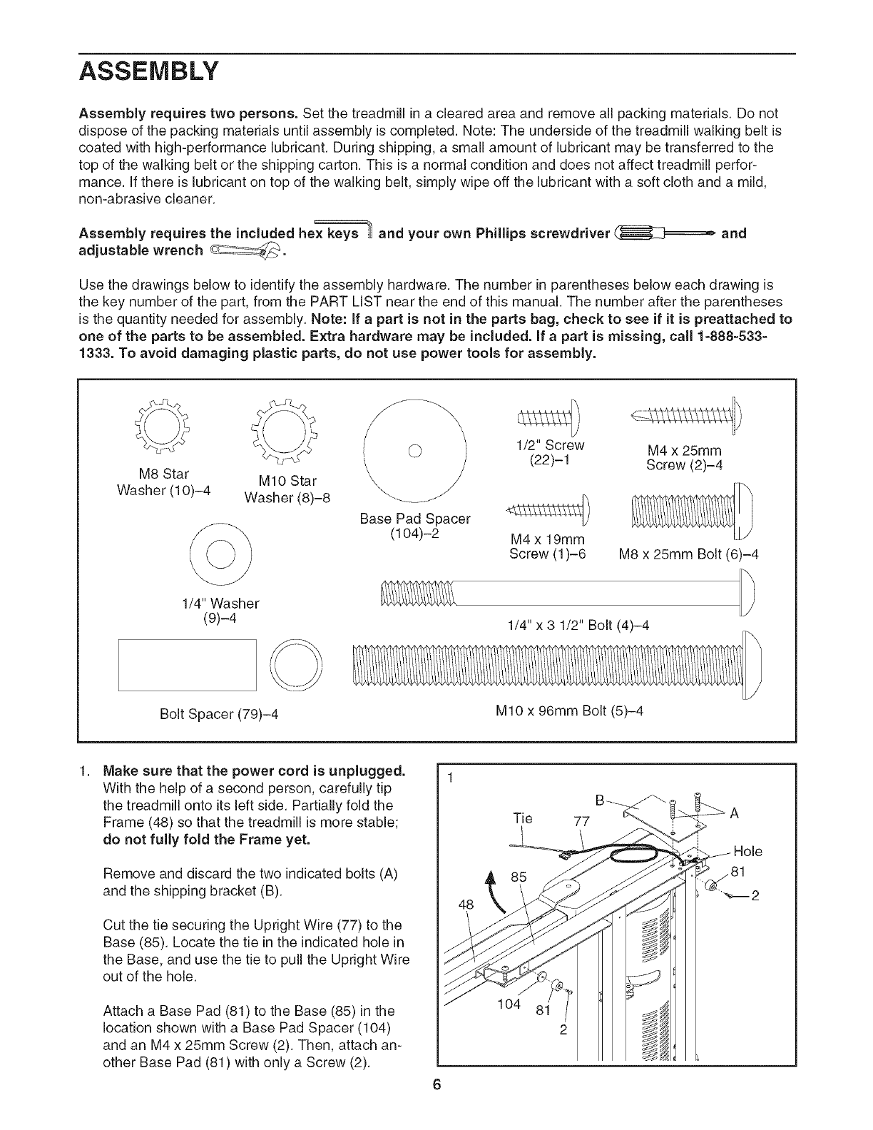 Assembly requires two persons. Set the treadmill in a cleared area and remove all packing materials. Do not