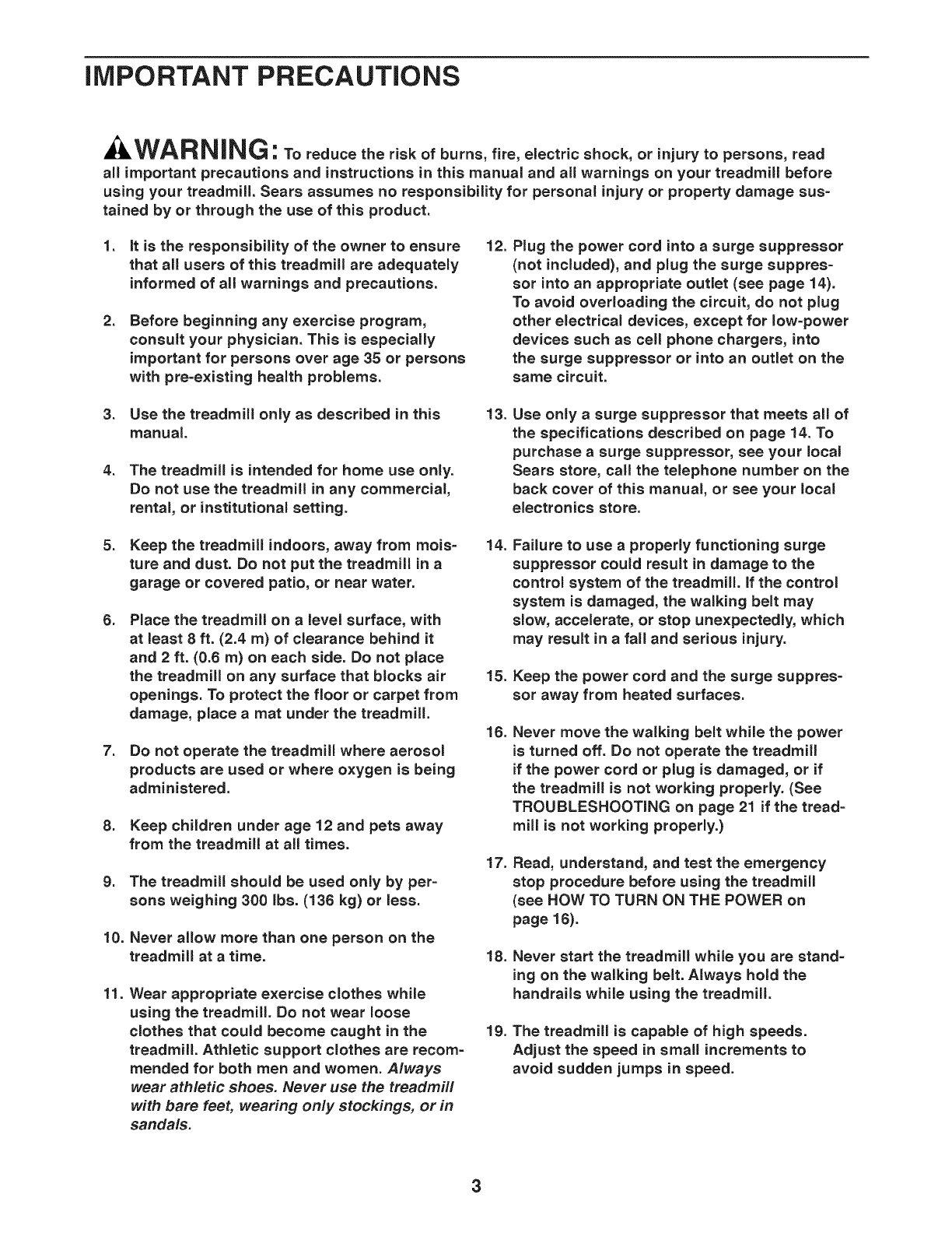 using your treadmill. Sears assumes no responsibility for personal injury or property damage sus-