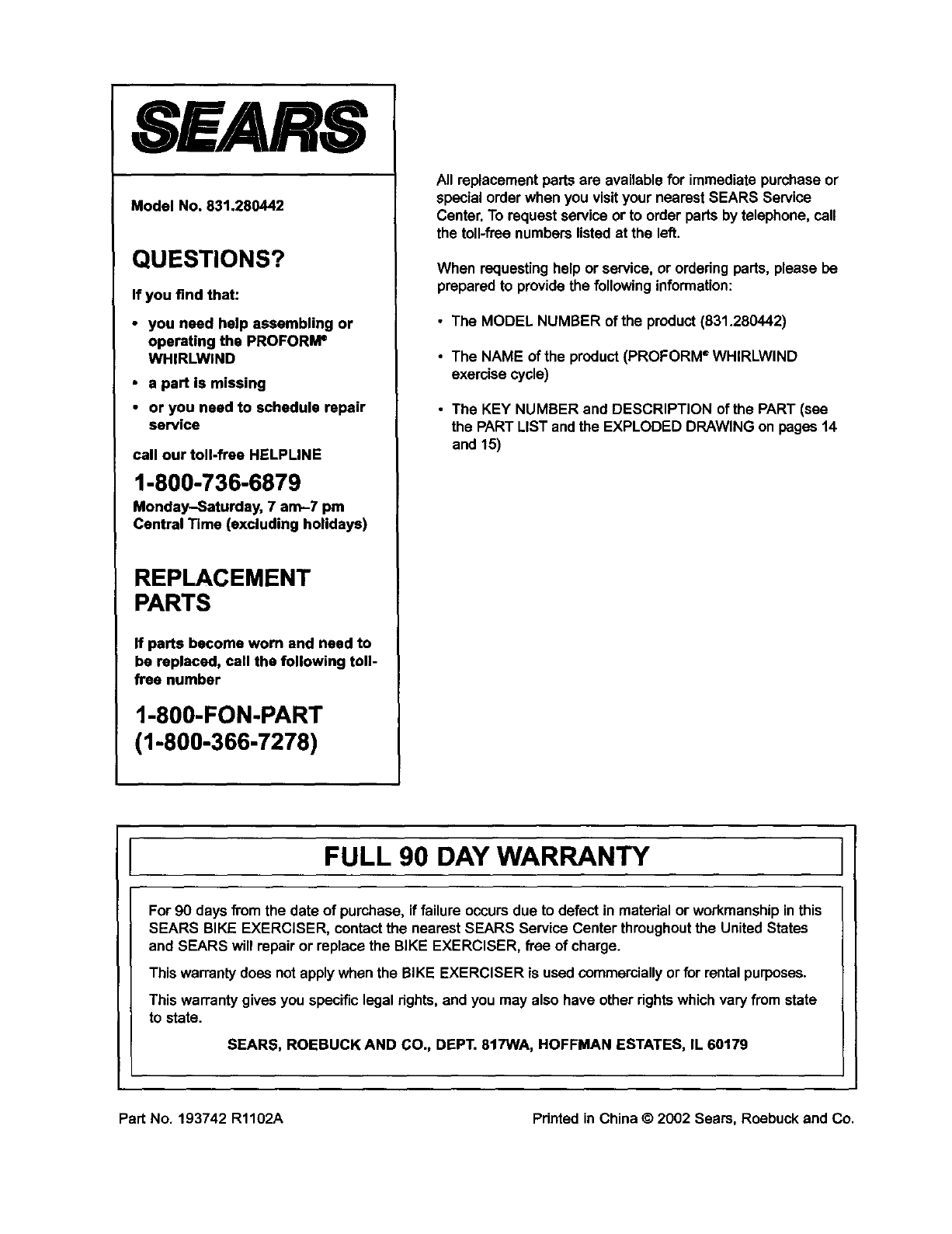 Part No. 193742 R1102A Pdnted in China © 2002 Sears, Roebuck and Co.