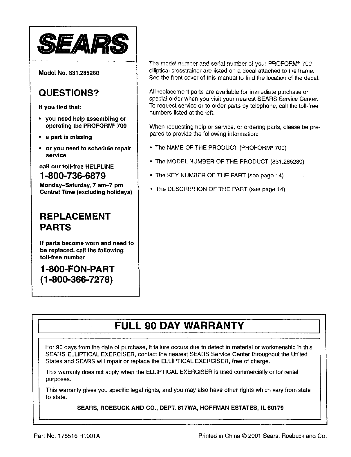 Part No. 178516 R1001A Printed in China © 2001 Sears, Roebuck and Co.