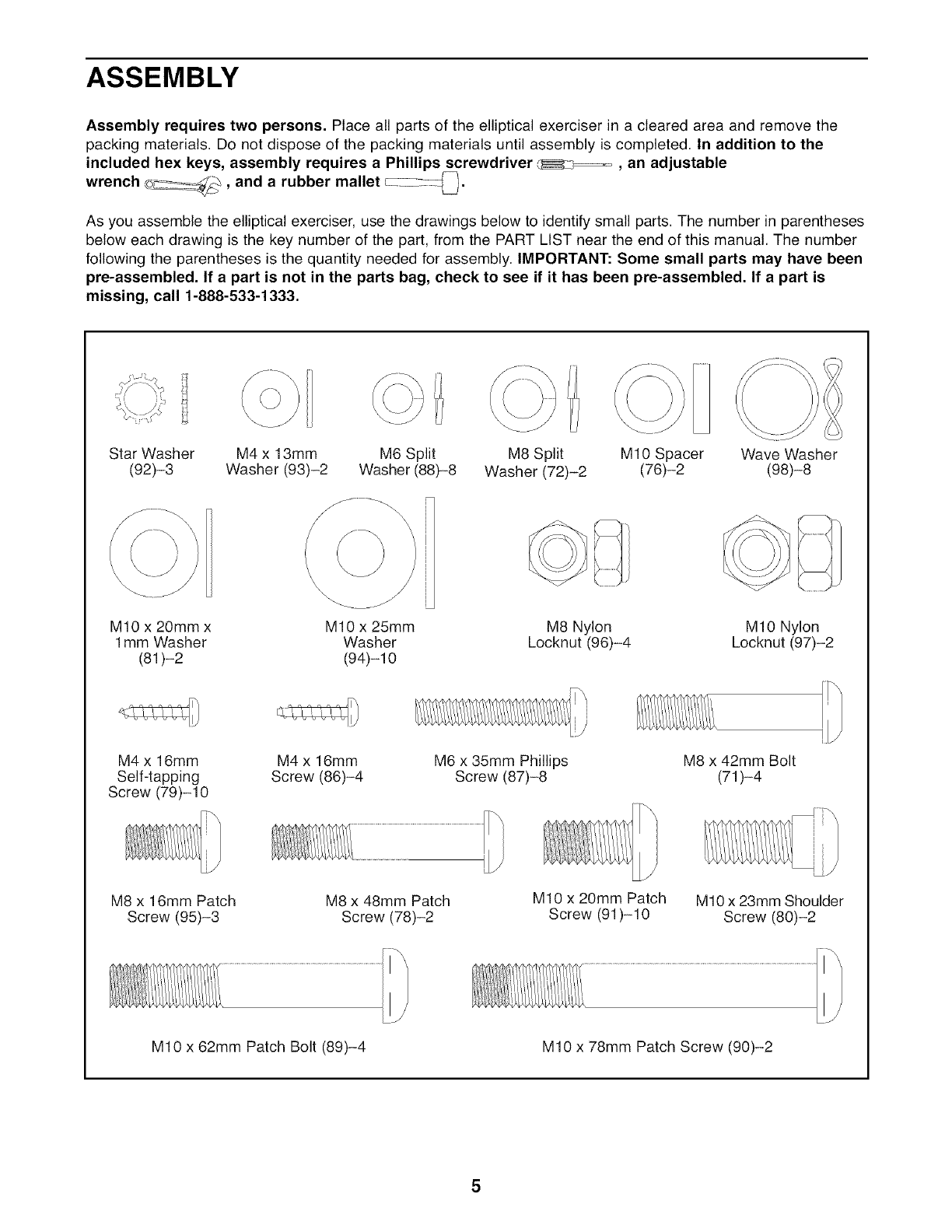 As you assemble the elliptical exerciser, use the drawings below to identify small parts. The number in parentheses