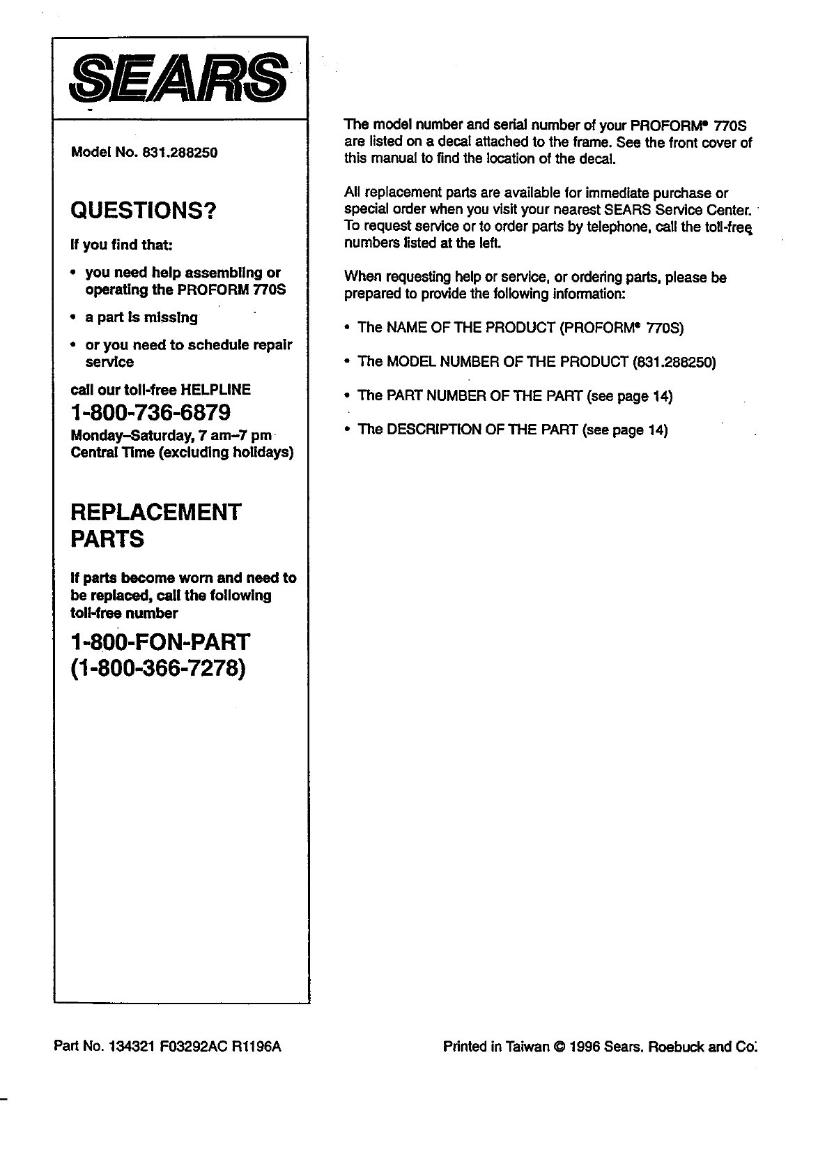 Part No. 134321 F03292AC R1196A Printed in Taiwan ©1996 Sears. Roebuck and Co_