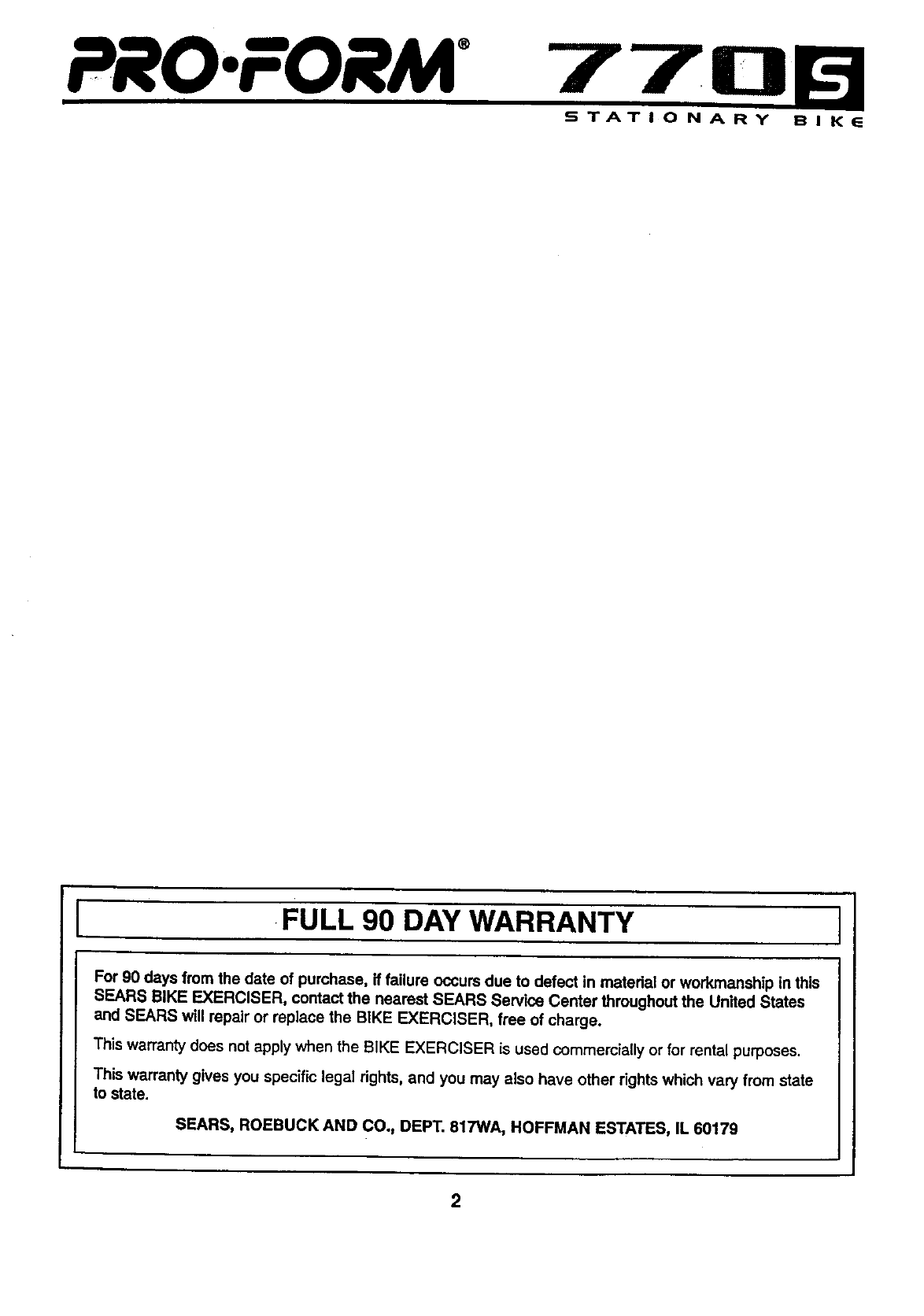 This warranty does not apply when the BIKE EXERCISER is used commercially or for rental purposes.