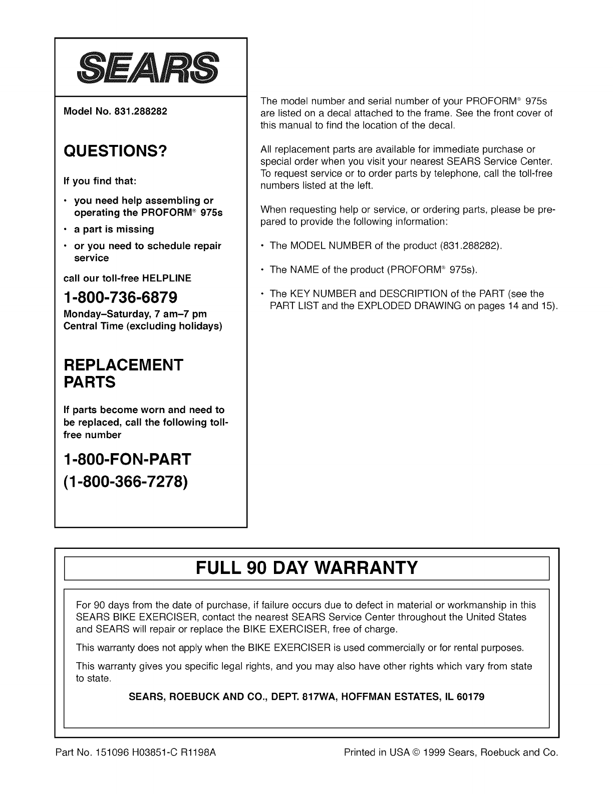 Part No. 151096 H03851-C R1198A Printed in USA © 1999 Sears, Roebuck and Co.