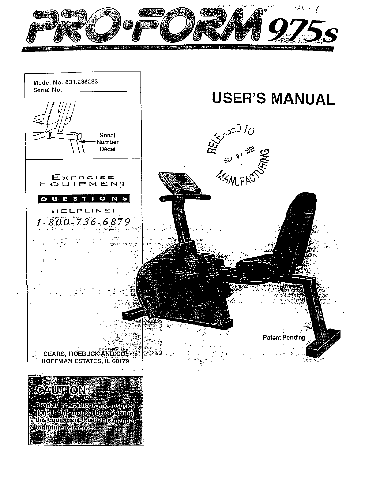 User Manual: Proform 831288283 831288283 PROFORM SEARS PROFORM 975S CYCLE - Manuals and Guides View the owners manual for your PROFORM SEARS PROFORM 975S CYCLE #831288283. Home:Fitness Equipment Parts:Proform Parts:Proform SEARS PROFORM 975S CYCLE Manual
