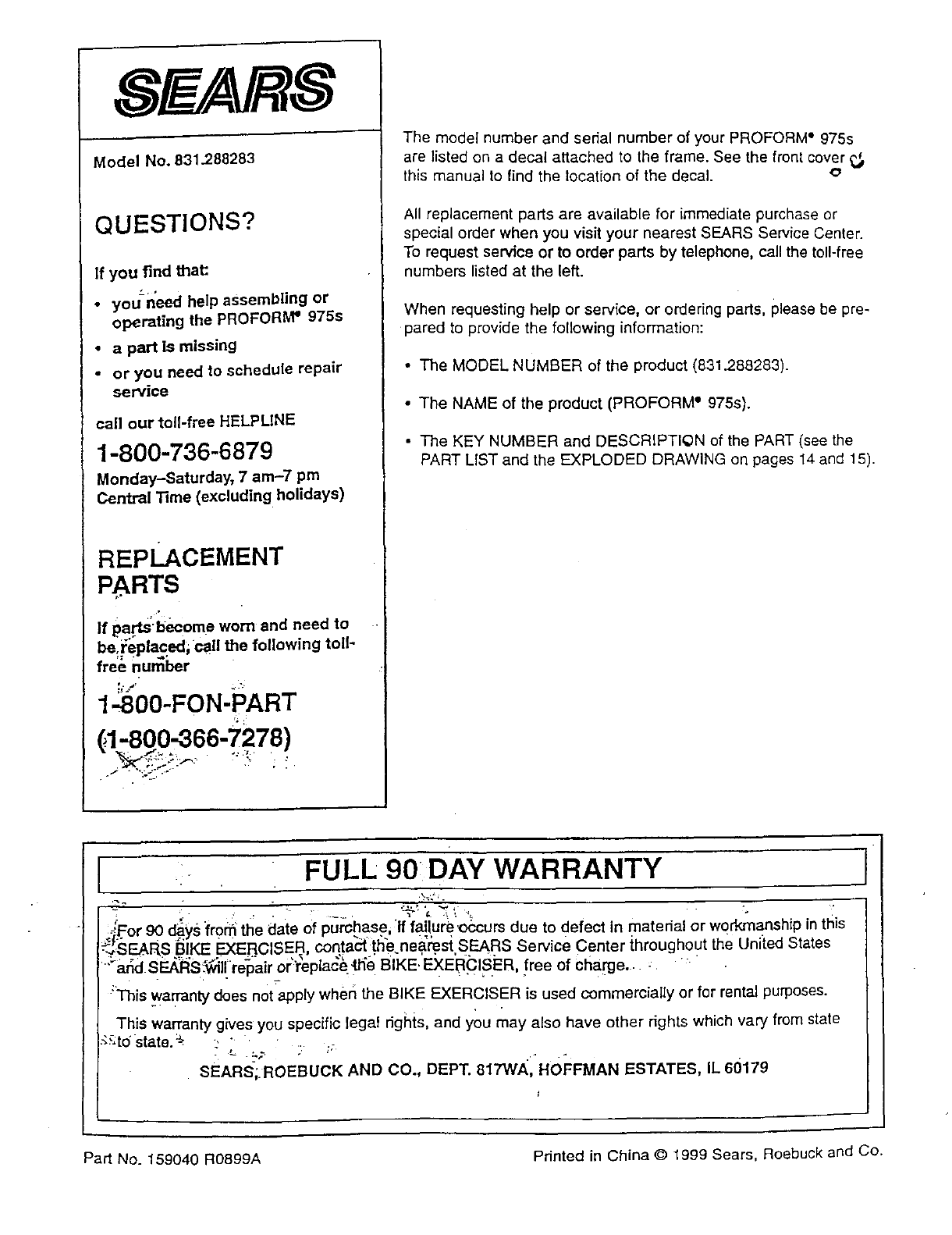 Part No. 159040 R0899A Printed in China © 1999 Sears, Roebuck and Co.