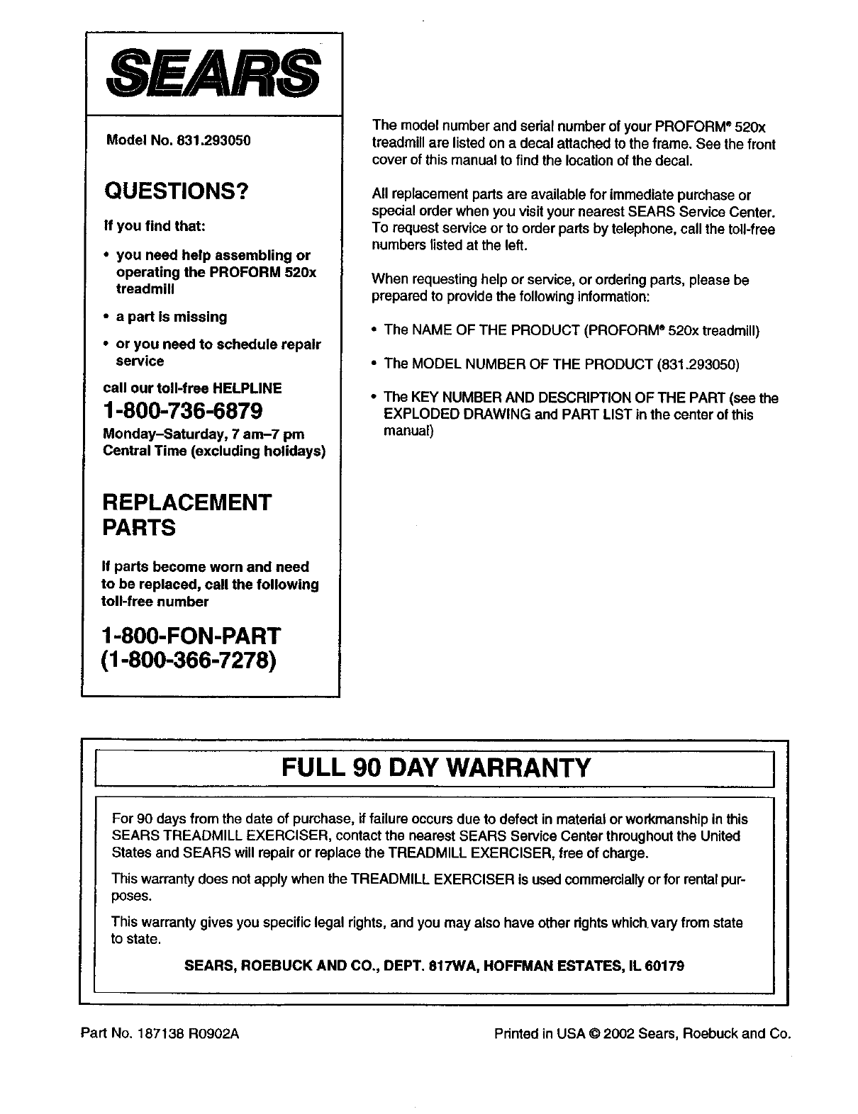 Part No. 187138 RO902A Pdnted in USA ©2002 Sears, Roebuck and Co.