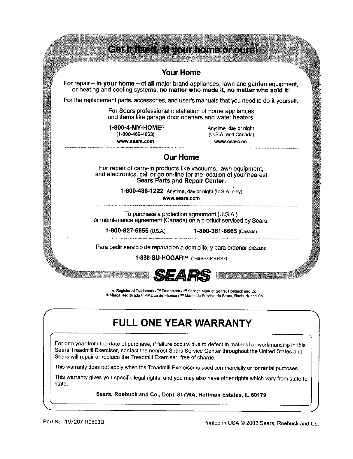 Part No. 197207 R0603B Printed in USA © 2003 Sears, Roebuck and Co.