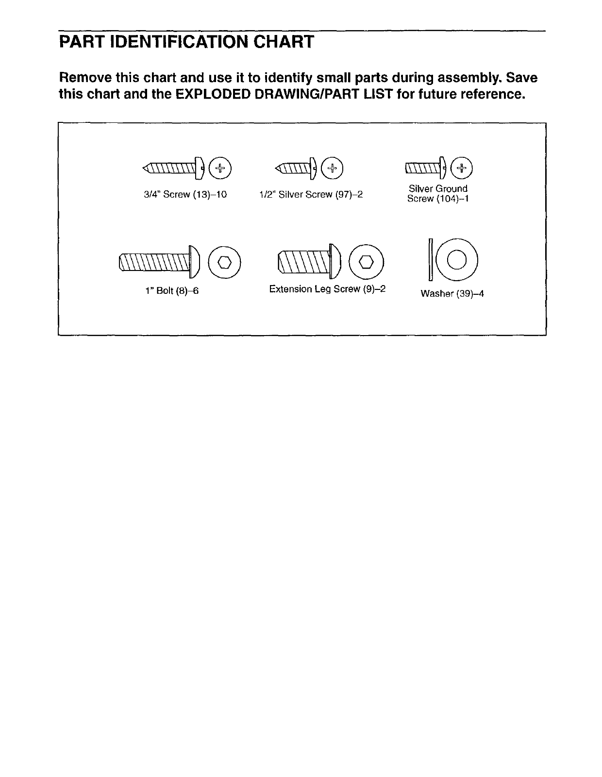 To identify small parts during assembly, use the PART IDENTIFICATION CHART in the center of this manual.