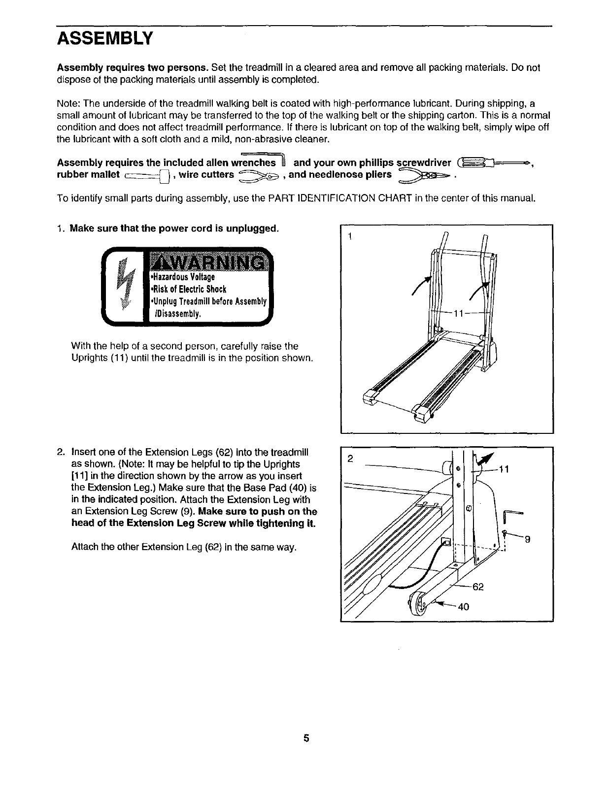 Assembly requires two persons. Set the treadmill in a cleared area and remove all packing materials. Do not