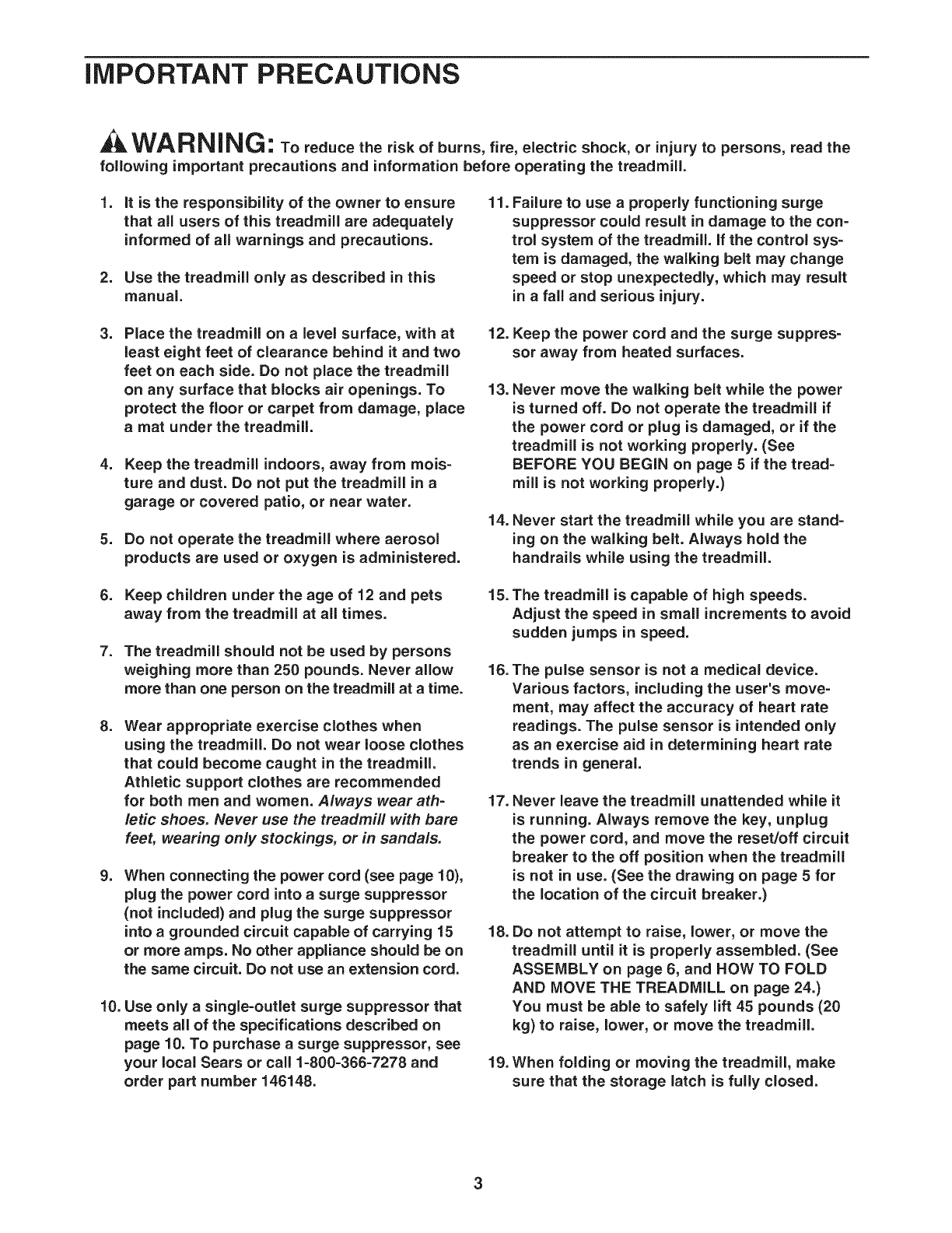 following important precautions and information before operating the treadmill.