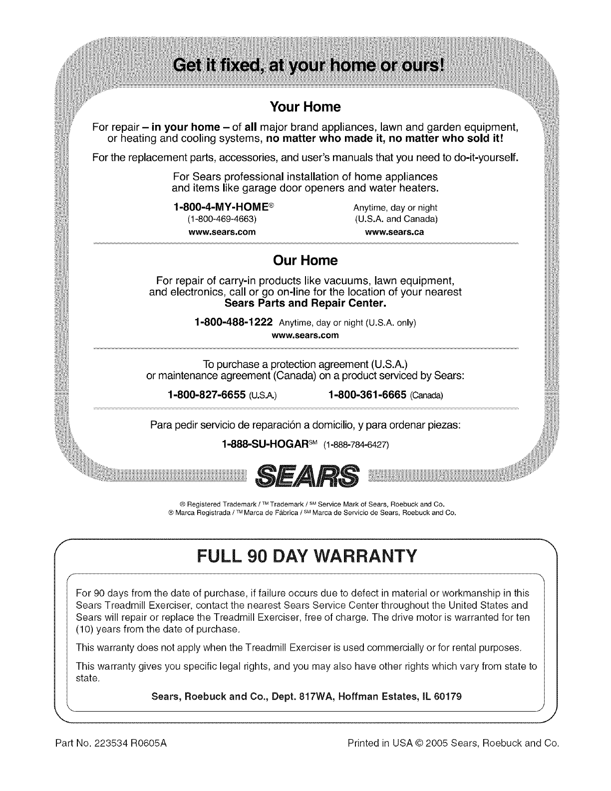 Sears Treadmill Exerciser, contact the nearest Sears Service Center throughout the United States and