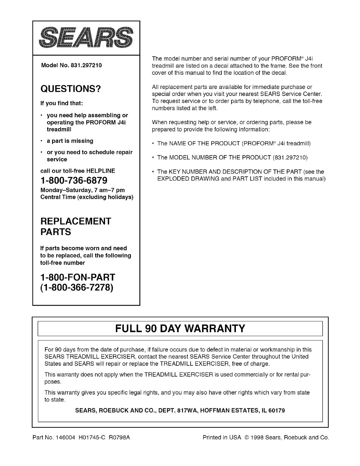 SEARS TREADMILL EXERCISER, contact the nearest SEARS Service Center throughout the United
