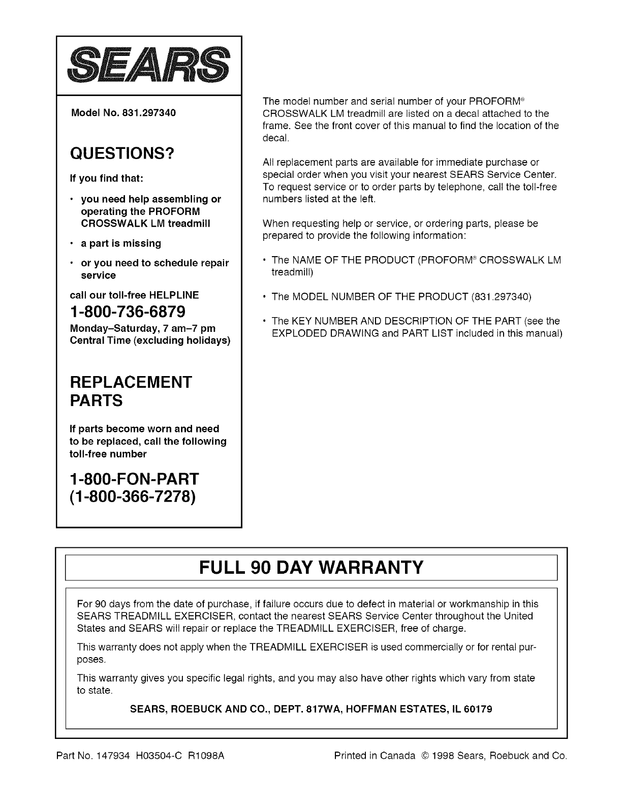 Part No. 147934 H03504-C R1098A Printed in Canada © 1998 Sears, Roebuck and Co.