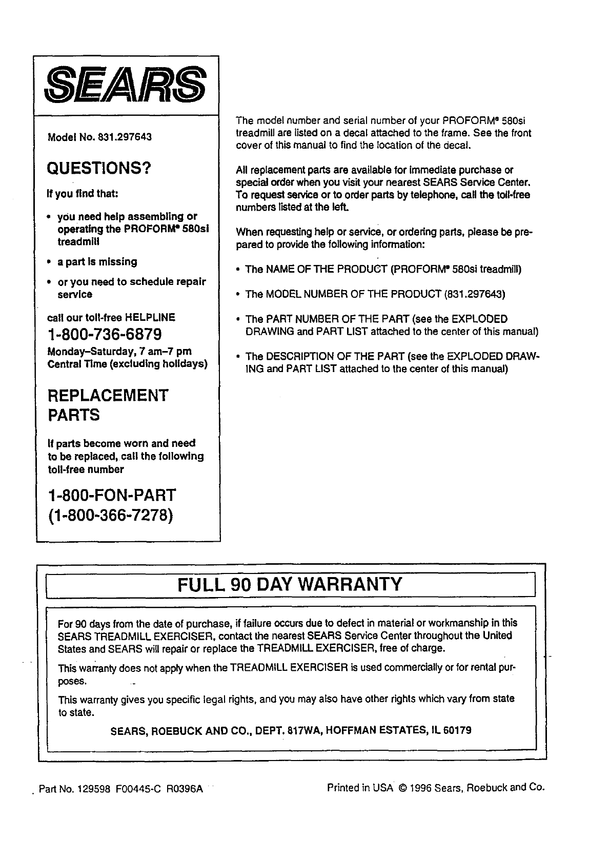 •Part No. 129598 F00445-C R0396A Printed in USA © 1996 Sears, Roebuck and Co.