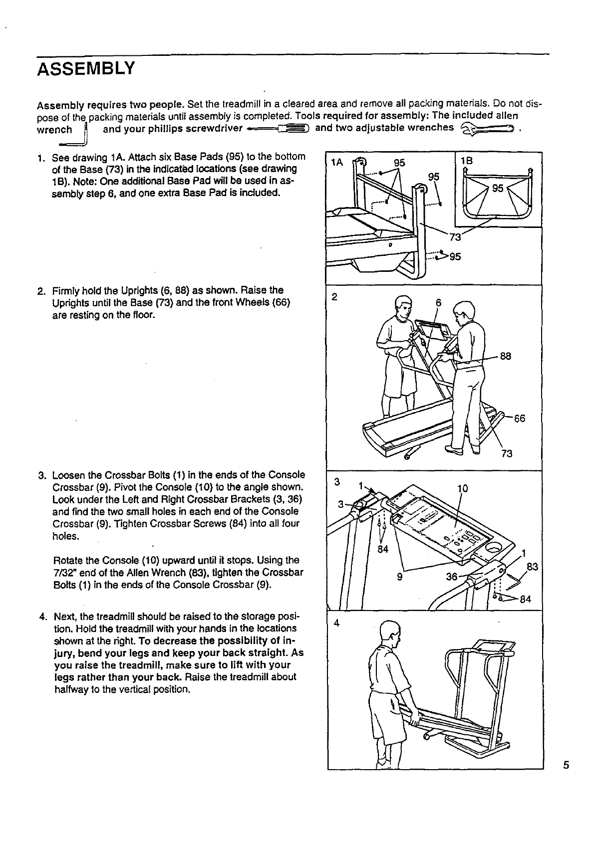 Assembly requires two people. Set the treadmill in acleared area and remove all packing materials. Do not dis-