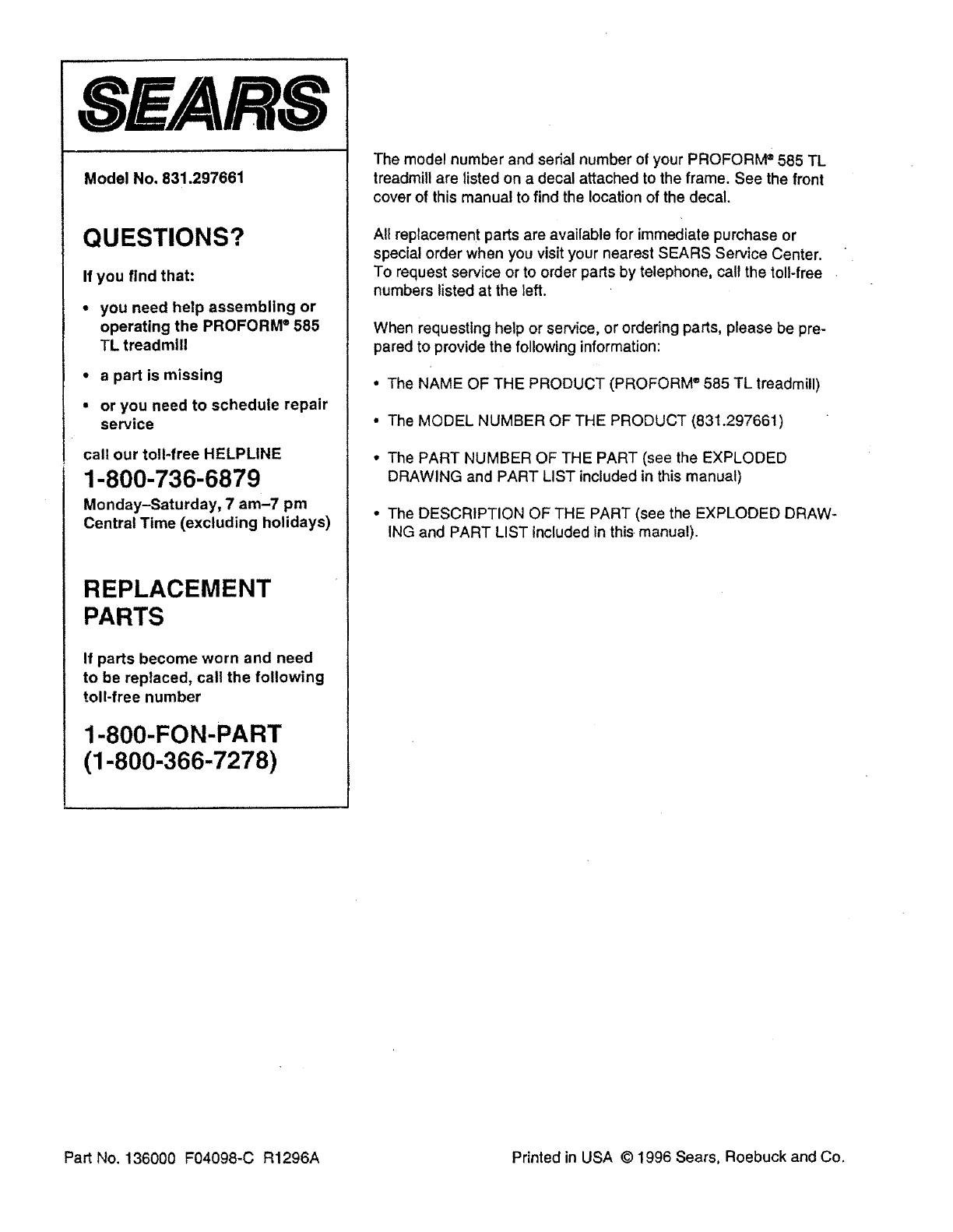 Part No. 136000 F04098-C R1296A Printed in USA © 1996 Sears, Roebuck and Co.
