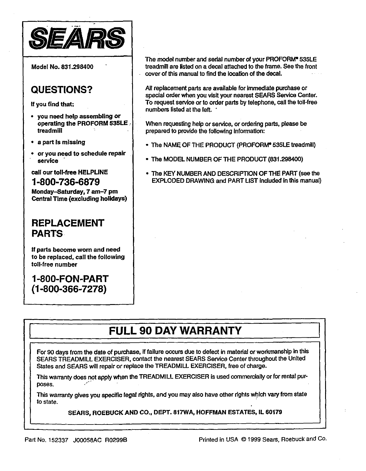 Part No. 152337 JOOO58AC R0299B Printed in USA © 1999 Sears, Roebuck and Co.